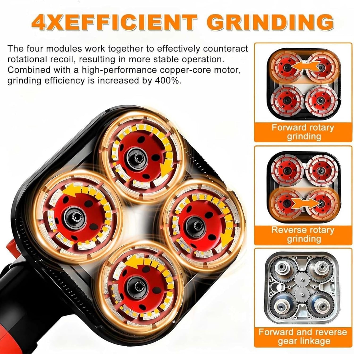 Features:★--☆Enhanced Grinding Efficiency: The electric diamond concrete grinder features a four-head design, significantly improving grinding efficiency.★--☆ Adjustable Speed: The floor polisher features six speed settings, ranging from 600-3000 rpm, easily adjustable to meet different grinding needs.★--☆Powerful 3600W Motor: Utilizing a pure copper motor, it offers powerful performance and excellent heat resistance, enabling precise and efficient grinding and polishing for a professional-grade, superior surface finish.★--☆ 90° Grinding Angle: The floor polisher is equipped with a detachable top dust cover, enabling 90° corner grinding, easily handling narrow corners and leaving no dead angles.【Specifications】 Product Name: Four-Head Industrial SanderMotor: Pure Copper MotorMotor Power: 3600WRated Voltage: 110V-220VNo-Load Speed: 600-3000 rpmGear Adjustment: 6-speed adjustableSandpaper Diameter: 100mm / 4 inchesPackaging Dimensions: 55.5*37.5*22.5 cm / 21.85*14.76*8.86 inchesWeight: 9.5 kg【Package List】1 x Four-Head Sander2 x Hex Wrenches4 x Wet Abrasive Discs4 x Sandpaper4 x Abrasive Sheets4 x Diamond Discs1 x Power Cord1 x English Instruction Manual