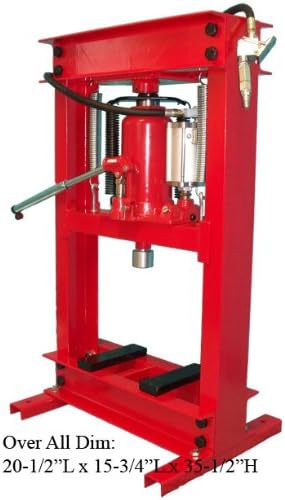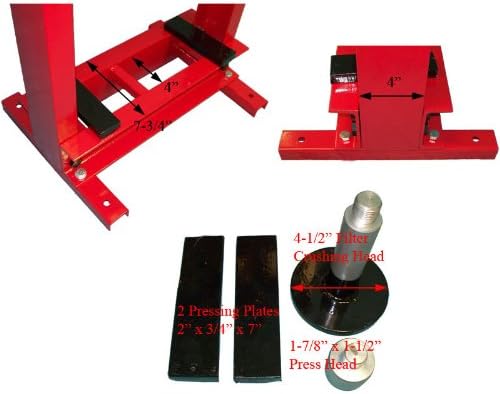 Other Features: -Ram travel is 6-1/2" with heavy duty return springs for fast ram return.~ -Height range of the bottle jack is 10-1/4" to 20".~ -The air inlet fitting is 1/4" NPT with a working PSI of 110-120 .~ -The crusher compresses most automotive and light truck filters (6" L x 4" diameter) to just 1/4 of their original size and removes 90% of the oil from pre-drained filters.~ -The crusher has a 39" L x 11/16" diameter oil drain hose and an adjustable press plate and shield .~ -Included: 2 Press Plates, 1 Press Head and 1 Filter Crushing Head.~ -Over All Dim: 20-1/2"L x 15-3/4"W x 35-1/2"H.