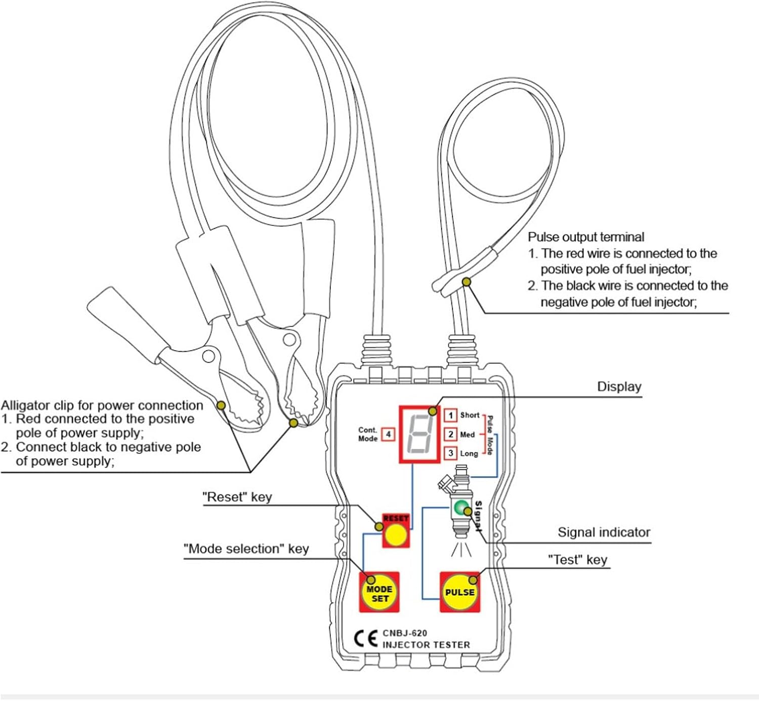 Item Type: Fuel Injector Tester and Cleaner KitModel: CNBJ-620Material: ABSPower Supply: DC12VWorking Conditions: 0℃-40℃; Relative Humidity 80%Storage Conditions: -20℃-50℃; Relative Humidity 85%Package List:1 x Fuel Injector Tester1 x User ManualNote:1. Before using this device, make sure to turn off the engine of the car.2. Do not smoking or ignite near the car.3. Avoid splashing fuel onto hot engine components of the car.4. Only use this device in well ventilated areas, and avoid inhaling exhaust gases from the car and vapors from fuel dispersion.5. Do not approach rotating(or moving) parts of any car, and avoid touch with any heated parts of the car.6. Do not short circuit the positive and negative poles of the car battery.7. Do not touch any car parts with dangerous voltages.8. Always follow the warnings, cautions, and maintenance instructions in the car maintenance manual.9. Wear qualified safety protective glasses.10. After testing, make sure to correctly reconnect all disconnected car connections.