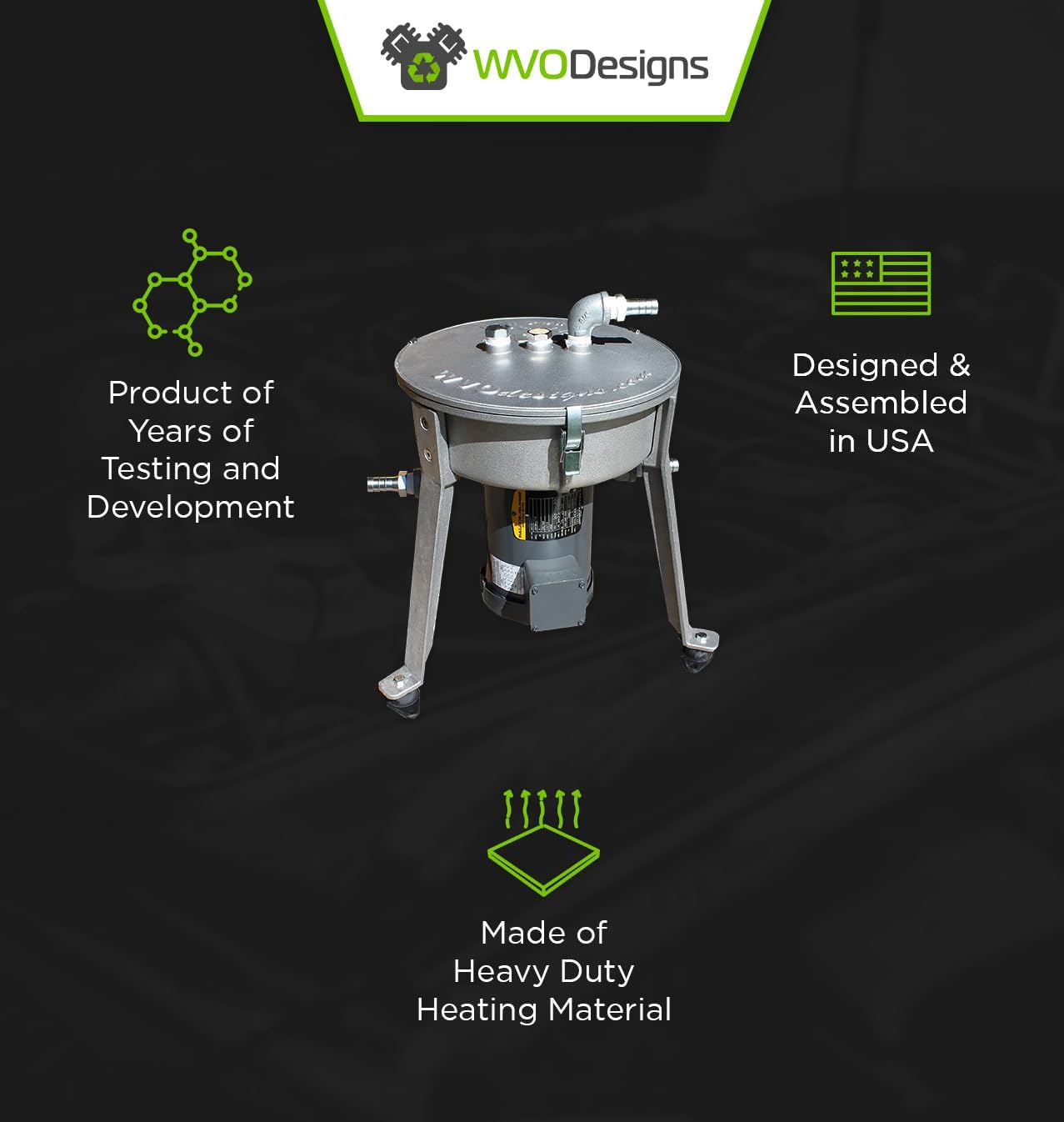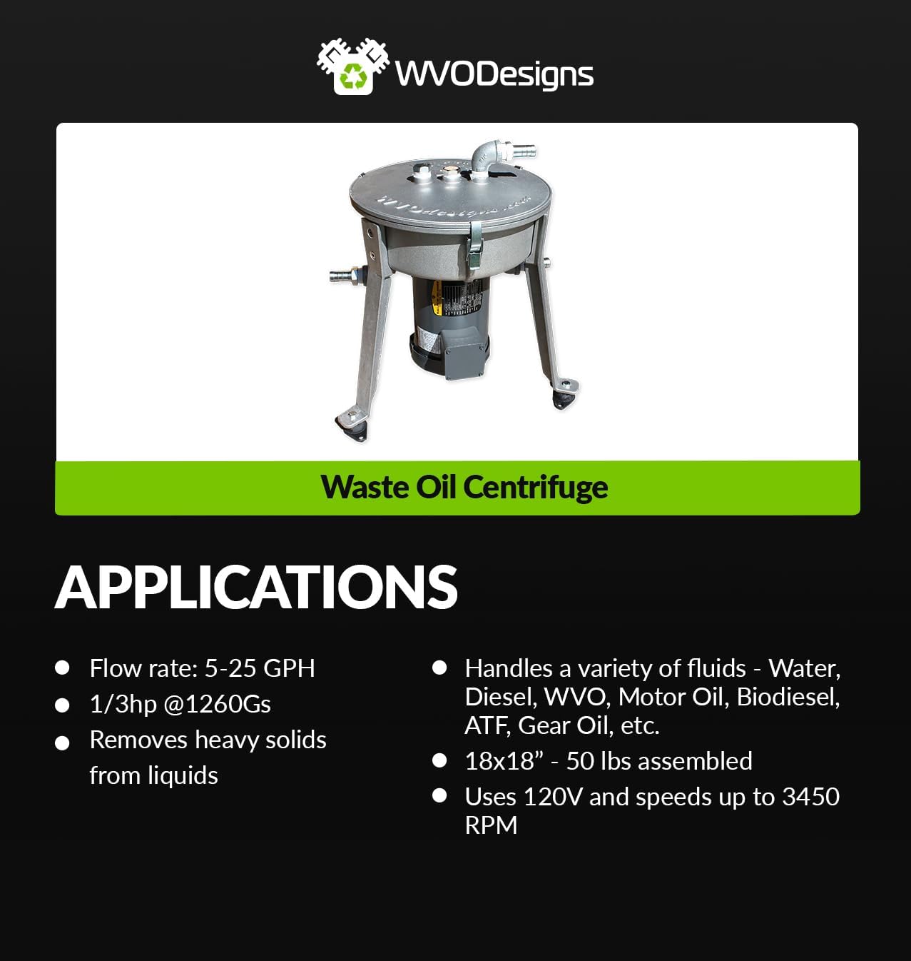 Versatile and Cost-effective Solution - The WVO Designs Waste Oil Centrifuge is the ultimate solution designed for cleaning a variety of waste oils including vegetable oils, motor oil, vegetable oil, AT, hydraulic oil, or any other fluids, and transforming them into a clean and reusable fuel which can be utilized in diesel engines or used in furnaces for heating. It is an essential tool that helps reduce waste, lower fuel costs, and most especially - contributes to a cleaner and greener community. High-Efficiency Extraction - This waste oil centrifuge is designed with the user’s safety in mind. Using this tool, we can ensure the oil is free from harmful and unwanted fluids or impurities by processing up to 25 gallons per hour. It can clean a significant amount of oil relatively quickly, making it efficient for medium-scale operations. This makes it ideal for cleaning oil used in waste oil furnace heaters.Proven and Tested - With over a thousand units in service since 2008, this Waste Oil Centrifuge is known for its reliability, durability, and unmatched performance in oil cleaning.______________________________________Waste Oil CentrifugeWaste Vegetable OilsWaste Oil Furnace HeaterWaste Oil FurnaceRaw Power Centrifuge