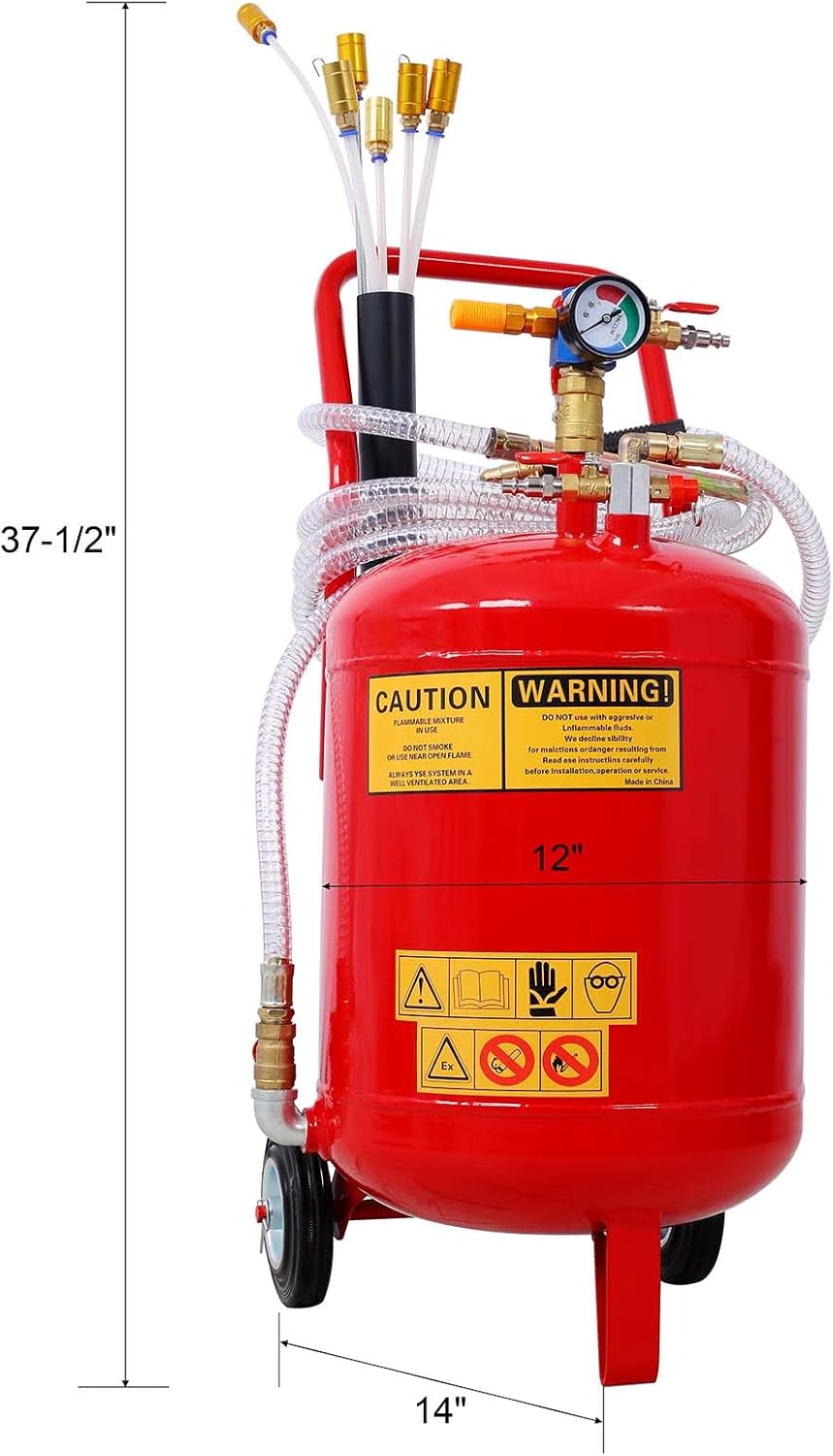 Featuring a robust steel tank with a generous 24-liter capacity, say goodbye to frequent oil changes and wastage. With six versatile suction probes, it ensures thorough extraction, reaching every last drop of motor oil. Safety is paramount with built-in overpressure protection, guaranteeing a secure and eco-friendly operation. Designed for user convenience, it boasts a user-friendly design with visible indicators and portable handle for easy maneuverability. Whether in the garage or professional auto shop, this extractor is your go-to solution for efficient and hassle-free oil extraction. Upgrade your automotive maintenance game today!SpecificationMain Color: RedMain Material: SteelProduct DimensionsAssembled Length (in.): 14.00Assembled Width (in.): 14.00Assembled Height (in.): 37.50Weight (lbs.): 29.70