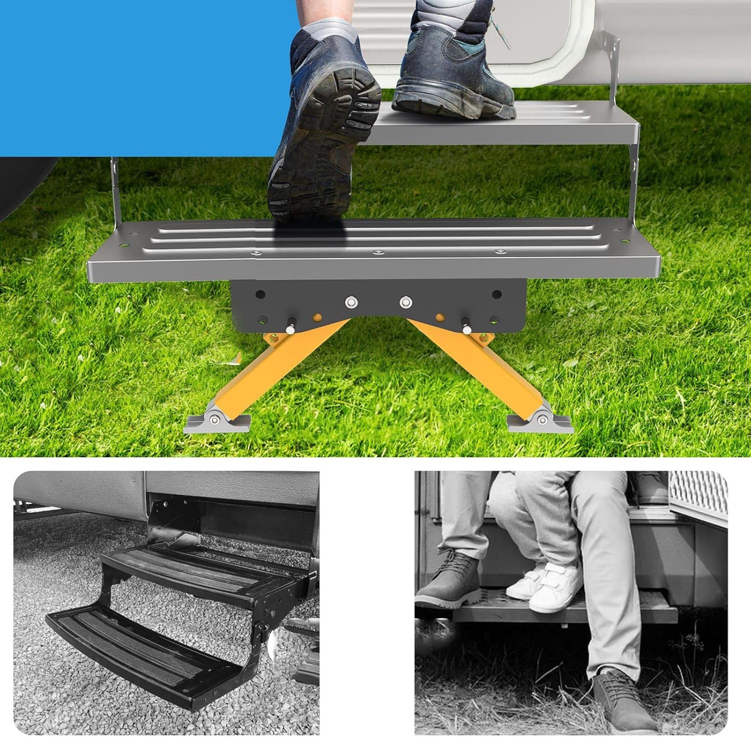 1. [ADJUSTABLE AND FOLDABLE DESIGN] Easily adjust the height and angle for stable entry and exit. No tools needed! 2. "[ACCURATE POSITIONING] Fine processing allows precise adjustment. Non-slip rubber pads for secure footing on any surface. 3. "[ENHANCED STABILITY] Sturdy support points eliminate sway, providing confidence with every step. Ideal for 5th wheels, trailers, and RVs. 4. "[DURABLE STAINLESS STEEL] High hardness and rustproof material ensure long-lasting use. Strong load-bearing capacity for outdoor adventures. 5. "[EASY INSTALLATION] User-friendly folding design for quick setup. Strong adaptability to meet your needs for a smoother outdoor experience. Specification: Item Type: RV Step Stabilizer Material: Stainless Steel Support Height Range: Approx. 7.1-29cm / 2.8-11.4in Application: For 5th Wheel, Travel Trailer, RV, etc. How to Use: Take out the product for direct use. packing list: 1 x Step Stabilizer