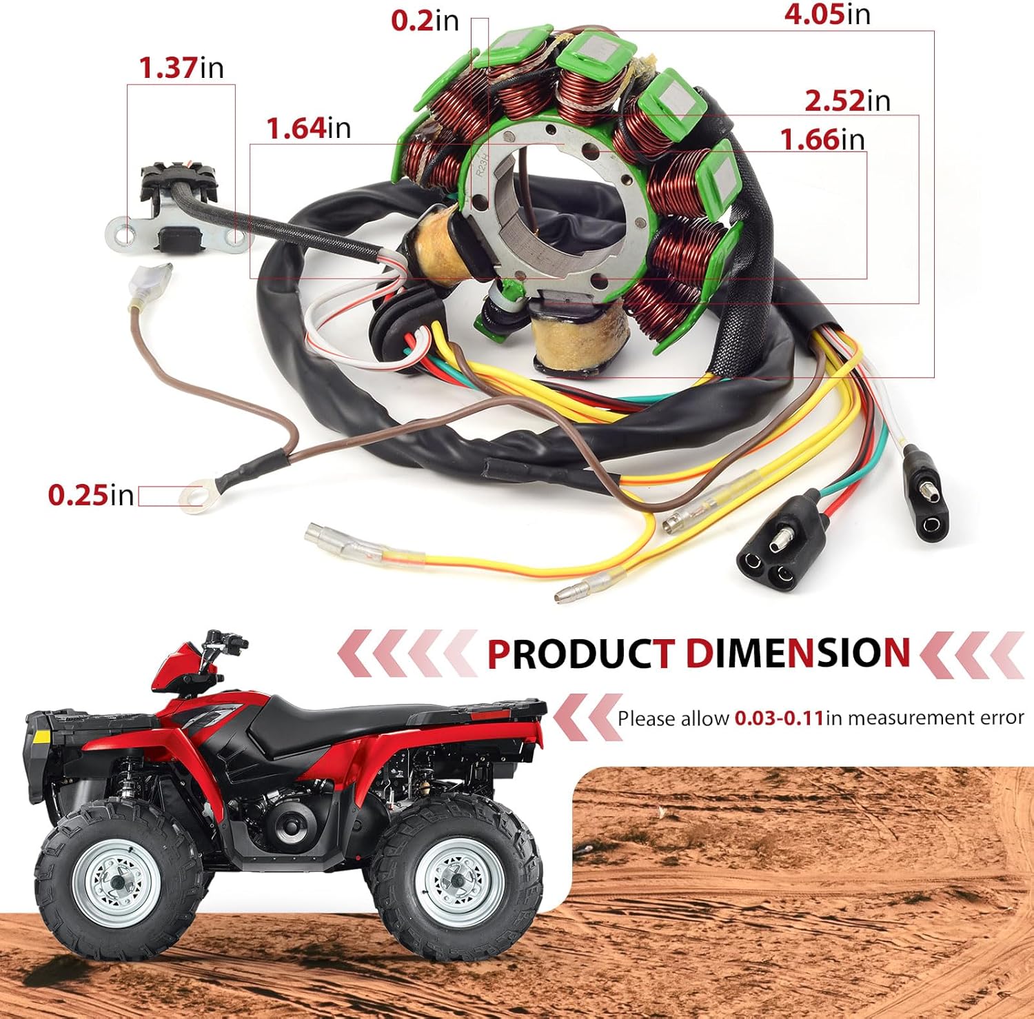 Package:1x StatorManufacturer Part:30849743086860This Accessories fits the following models:For PolarisMagnum 425 2x4 1995Magnum 425 2x4 1996Magnum 425 2x4 1997Magnum 425 2x4 1998Magnum 425 4x4 1995Magnum 425 4x4 1996Magnum 425 4x4 1997Magnum 425 4x4 1998Magnum 425 6x6 1996Magnum 425 6x6 1997Sportsman 335 1999Sportsman 335 2000Sportsman 400 2001Sportsman 400 2002Sportsman 500 4x4 1996Sportsman 500 4x4 1997Worker 335 1999Xplorer 500 4x4 1997Ranger 425 2X4 2001Ranger 425 2x4 2002 (If built before 8/09/02)Important Precautions:*Disconnect Battery: ALWAYS disconnect battery before starting to prevent shorts or shocks.*Cleanliness: Keep work area and stator mounting surface spotlessly clean. Dirt causes failure.*Correct Torque: Overtightening cracks stator laminations. Undertightening causes vibration damage. Use a torque wrench.*Wire Routing: Improper routing leads to melted wires or shorts. Keep clear of exhaust and moving parts.*Flywheel Removal/Install: Use the correct puller/socket. Striking it can damage bearings/stator. Tighten flywheel nut to spec.*Seals/Gaskets: Replace cover gasket/seal to prevent oil leaks.*Magnets: Handle flywheel carefully; strong magnets can attract metal objects violently.Key: Clean, Torque Correctly, Route Wires Safely, Disconnect Battery.