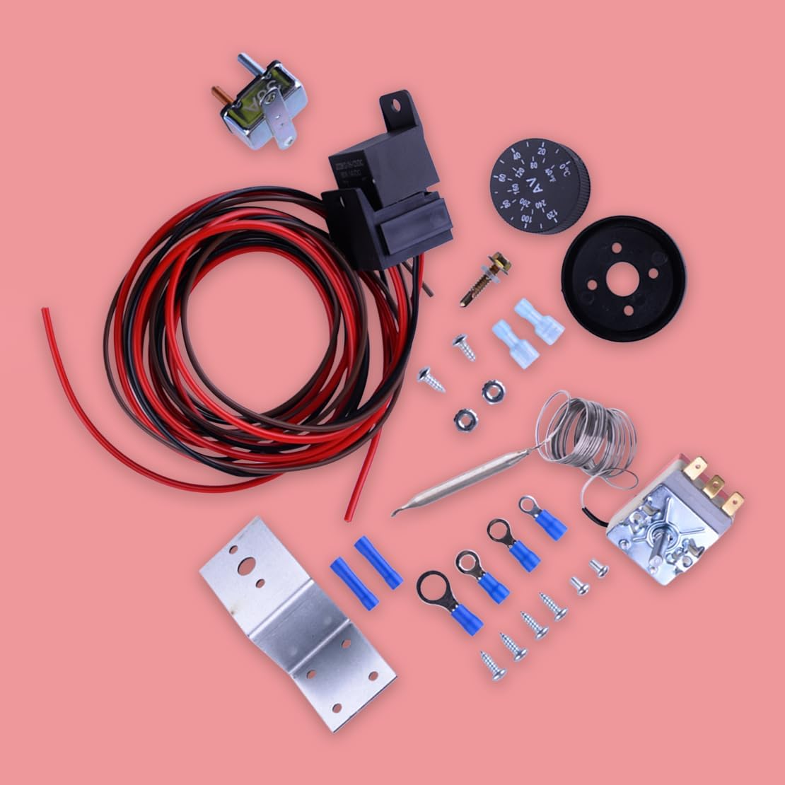 Condition: 100% new Color: as picture shows Material: Rubber & Plastic & Metal Wire Length: approx.76cm(59inch) Probe Length: 7.4cm(2.91inch) Auto Relay: 60A Circuit Breaker: 30A Voltage: 12V Temperature Range: 40-240 Fahrenheit scale (0-120 Degree Celsius) Item included:1 x Adjustable Thermostat Controller1 x Mounting Bracket1 x Turn Dial with Temp Markers5 x Mounting Screws2 x Butt Connectors1 x 30A Circuit Breaker2 x Female Connectors1 x 60A Auto Relay1 x Large Ring Terminal3 x Small Ring Terminals1 x Wiring Harness Suitable for: 12V cooling fan Compatible With: compatible for car, truck, boat, SUV This Is Aftermarket Replacement Item But Not Genuine Note:1) All dimensions are measured by hand, there may be small deviations.2) Color may vary slightly due to the color setting of each individual monitor.Feature:1) Stainless temperature probe sensor.2) Probe measures liquid or contact temperature and sends power to the fan. 3) Flexible turn-on/turn-off temperature control range of 32-248'F (0-120'C).4) 3-pin design allows thermostat to be wired as a normally open OR closed circuit.5) Probe can be mounted between radiator fins or inside inlet/outlet tube.6) Turn-off temperature is always 15 degrees less than turn-on.7) Thermostat dial has both Celsius and Fahrenheit temperature markings.8) A good replacement for the old or broken one.9) Wear resistant, durable, and long service life.