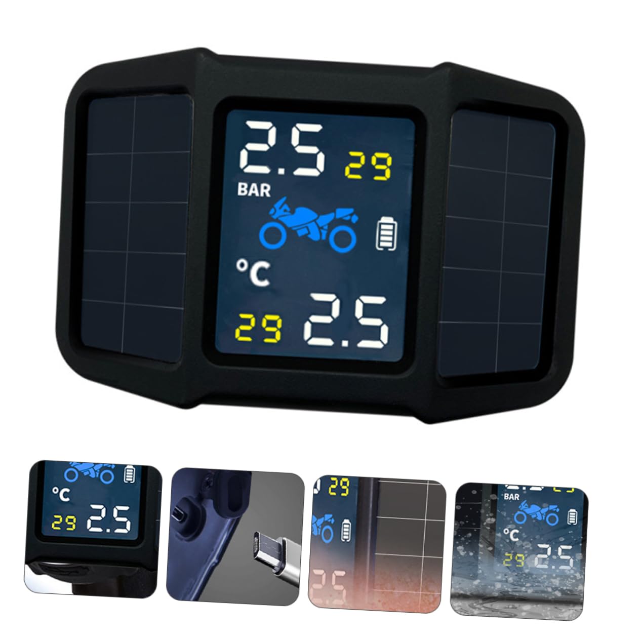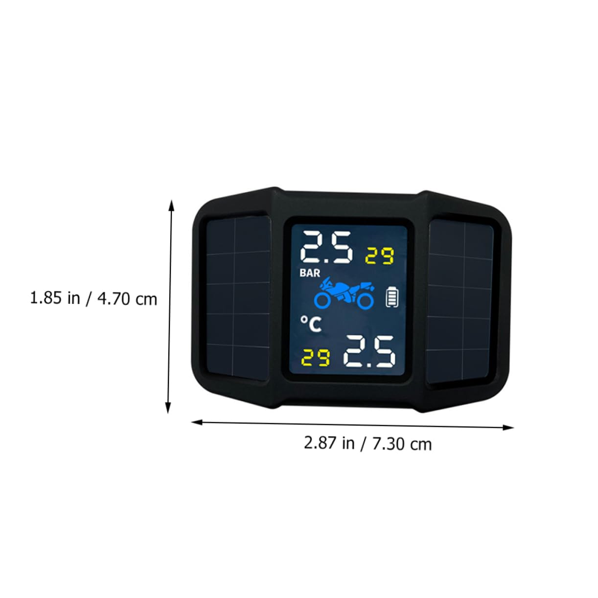 Package List 1 x host 1 x sensor Features -Material: Plastic Tire Pressure Monitoring Tool -Tire monitoring accuracy: Plus or minus 2°C motorcycle supply -Charging: USB tire pressure monitoring equipment -Power supply: Battery (Included) Tire Pressure Sensor for Motorcycle -Tire pressure monitoring accuracy: 0.1 BAR tire pressure monitor -Color: Black -Size: About 7.30X4.70X2.00cm/2.87X1.85X0.79in - materials make it have wear resistance and durability tire pressure sensor. - The product is simple to operate, saves time and effort, and you can use it easily motorcycle accessories. - The product is efficient and practical, accurate in measurement, and can detect whether the tire pressure is normal durable tire pressure measuring tool. - The carefully crafted tire pressure sensor has a smooth and comfortable surface, can use it with peace of Tire Pressure Sensor. - You can buy this convenient and practical tire pressure monitor at an tire pressure equipment.Goods DescriptionMotorcycle Tire Pressure Sensor This is a motorcycle solar tire pressure monitor, which can know the real-time tire pressure and on the screen.tire pressure monitoring equipment This is a very practical tool that can be used in your life and help you extend the life of your tires.Tire Pressure Monitoring Tool It is designed to protect your travel safety and provide you with early warning of air leaks and other abnormal tire conditions