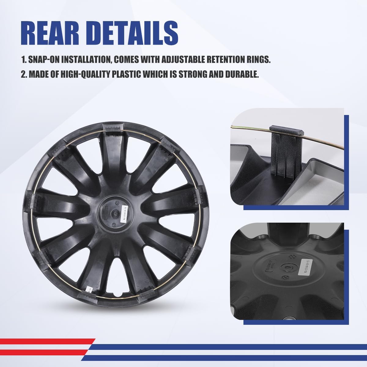 • ✅ Protection - These 15 inches hubcaps have the A grade retention ring and adjustable buckle design for a perfect, snug fit on your wheels. And they could wrap around the entire rim to protect your wheels against scratches and scuffs from curbs and other obstructions