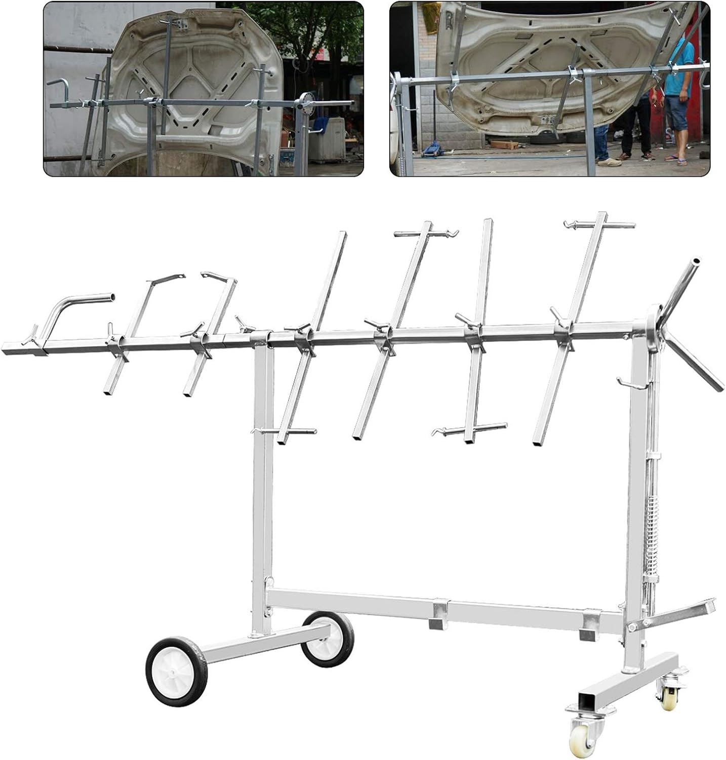 FeatureThe four-wheel design of this automotive spray painting rack enhances the flexibility and convenience of the equipment, making it easier to move around in the workshop. Excellent materials ensure stable load-bearing capacity and flexible use, allowing it to adapt to various working environments. Its reasonable structure enhances its overall balance, making it easier for operators to efficiently complete spraying tasks.SpecificationMaterial: Carbon SteelColor: SilverStyle: ModernProcess: Plastic SprayingInstallation Type: FreestandingNumber of Wheels: 4(One with Brake)Max. Load Capacity: 150kg/330.69 lbsProduct Size: 200*95*70cm/78.74*37.4*27.56inHandles Gap Distance: 30cm/11.81inPackage Size: 122*29*14cm/48.03*11.42*5.51inGross Weight: 27.05kg/59.64 lbsNet Weight: 25.7kg/56.66 lbsPackage Included1* Automotive Spray Painting RackNotes1. Please be aware that hanging items that are too heavy can cause this shelf to shake.2. Please use the product within its weight capacity to avoid damage.3. Please check the size carefully before ordering.4. Please allow the slight color difference caused by the shooting light and the 1-3 cm error due to manual measurement, and make sure you do not mind before ordering.