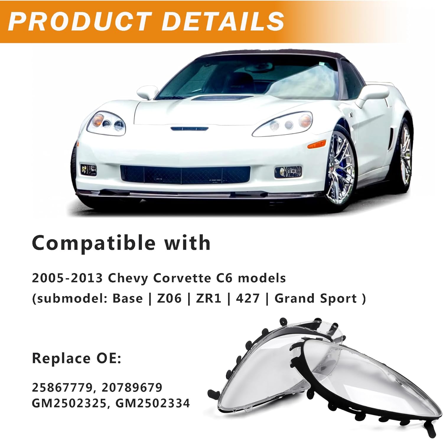 Headlights Lens for 2005-2013 Chevy Corvette C6Fitment: Fit for 2005 2006 2007 2008 2009 2010 2011 2012 2013 Chevy Corvette C6Color: Clear LensPackage Inlcudes: 1 x Pair of Headlights LensPartslink Number: GM2502325, GM2502334OEM Number: 25867779, 20789679, 25867785