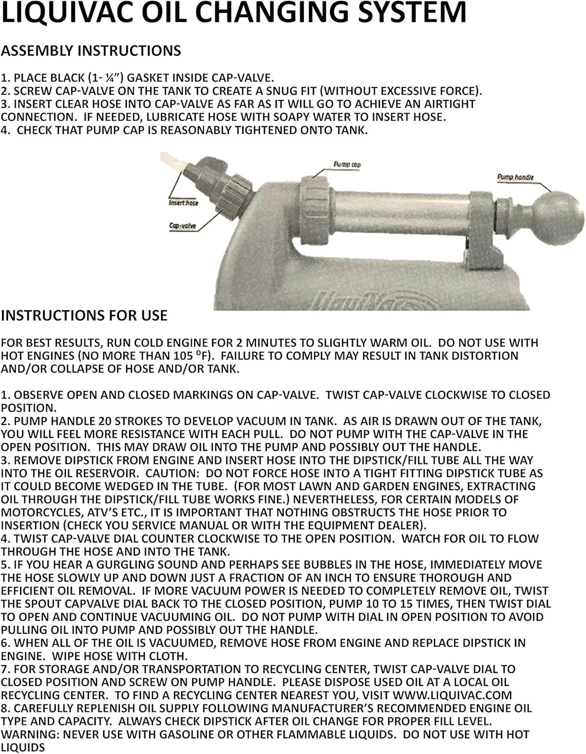 Changing engine oil can be messy, time consuming and there is no good way to dispose of old oil. The LiquiVac is a new user friendly and environmentally safe oil changing system. It is fast, convenient and eliminates mess and clean-up. The LiquiVac works by creating a powerful vacuum that draws the used oil out of the engine and into a holding tank for easy disposal to a recycling center. Simply insert the extraction hose into the dipstick tube, pump the handle 20 times, release the hose clamp and LiquiVac extracts the oil directly into its plastic holding tank. Works great for lawn and garden engines, go-karts, generators, ATVs and more. USA dimensions: 15-1/2 inches length x 8-3/4 inches width x 5 inches, tank size: 3/4 gallon, suction hose length 48 inches.