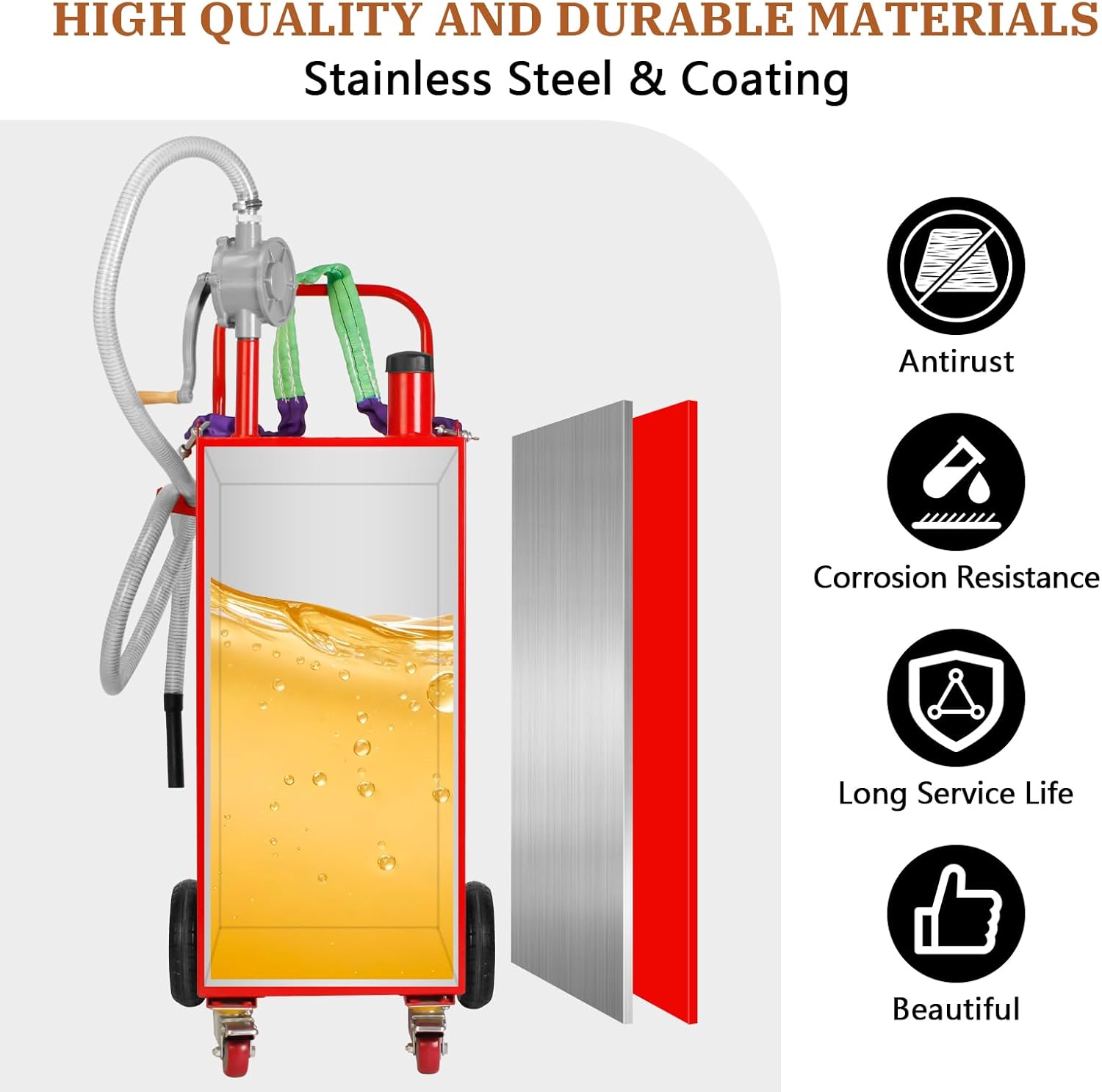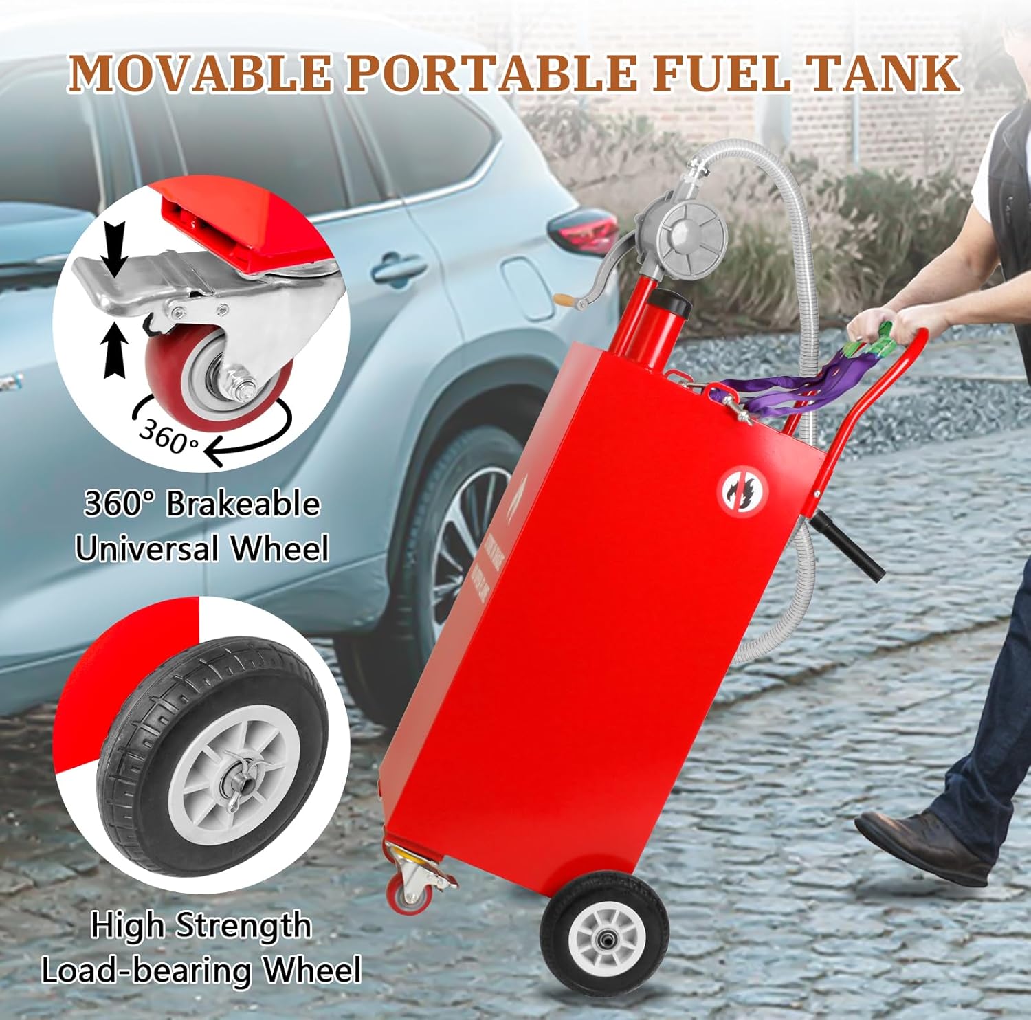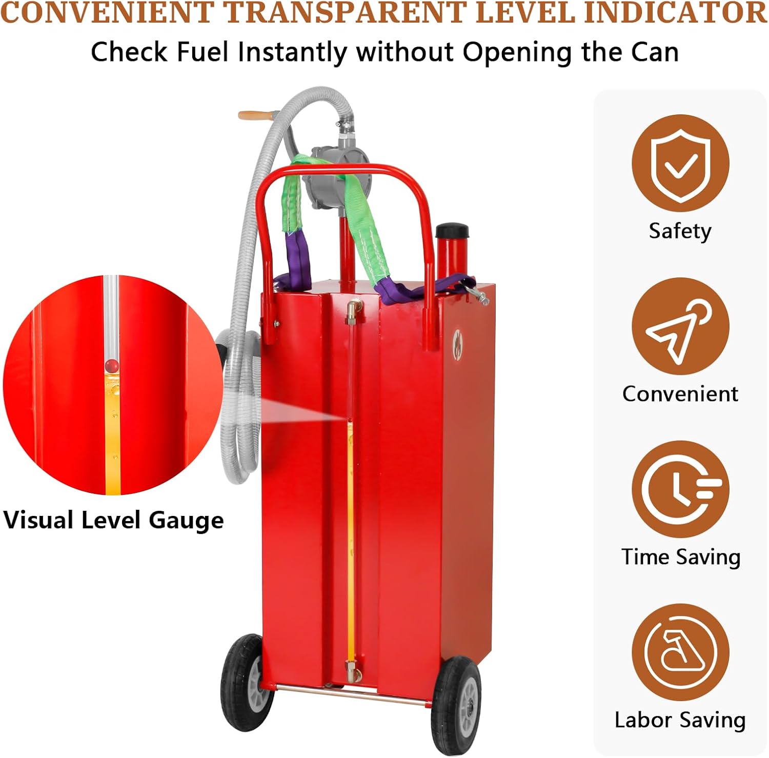 Meet the ultimate 30-gallon fuel caddy with pump! Its clear visual gauge lets you monitor levels, while the integrated lifting strap and 4 wheels enable easy transport. The bi-directional hand pump ensures clean, efficient fueling. Built from rugged, corrosion-resistant steel with a safety clip, this portable gas tank is your all-in-one refueling solution.