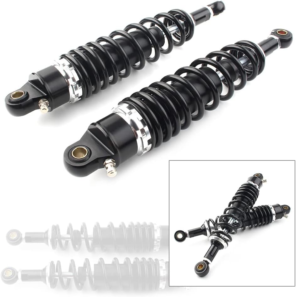 Fitment:Universal for Motorcycles.Specification:Color: Black & Silver.Internal Copper Sleeve Size: 12mmSize and Quantity of External Copper Sleeve: 2*10mm.Spring Diameter: 7mmBearing Weight: 450 Pounds.Total Length: 350MMLength of Eye to Eye Core: 320mm.Adjustment Tool: One WrenchPlacement on Vehicle: Rear.Features:Top quality material and design offer great performance.Brand New.Ensure the comfort when riding.No instruction included, professional installation is recommended.well for 320mm (12.6 inches) eye-to-eye length, we recommend to consult with your local dealers or measure the eye to eye length of your shocks . Great replacement for your old shock absorbers, upgrading the exterior appearance of your vehicle.package:Packaged Included: 1 Pair Shock Absorbers.