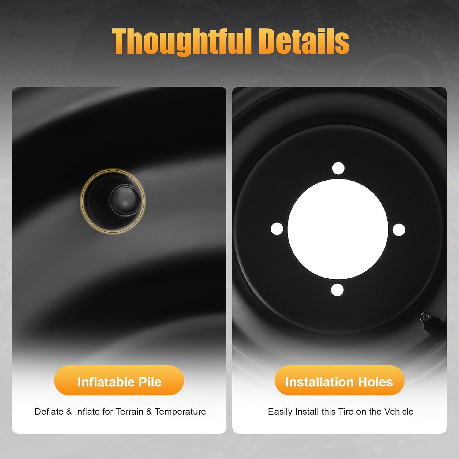 Description Just like a person needs to wear suitable boots, your vehicle also needs a high-performance tire. Our tire is made of wear-resistant materials and designed with precise tread patterns, which not only provide a strong grip but also effectively cope with the challenges brought by complex road conditions. Don't hesitate, to come and purchase to upgrade your vehicle! Details Inflatable Pile: It is equipped with a cover that allows you to deflate and inflate according to the terrain and temperature. Installation Holes: It allows you to easily install this tire on the vehicle. Application It is suitable for ATVs and karting. Specification Material: Carbon Steel, Rubber Process: Injection Molding Wheel Type: Inflatable Tire Color: Black Style: Modern Assembly Required: No Breaking Strength: 15875.73kg/35000lbs Center Hole Diameter: 90mm/3.54in Installation Hole Spacing: 78mm/3.07in Installation Aperture: 10mm/0.39in Product Size(D*H): 55*23cm/21.65*9.06in Package Size: 52*23.5*53cm/20.47*9.25*20.87in Package Included 1 * All-terrain Tire Notes Please allow the slight color difference caused by the shooting light and 1-3cm error due to manual measurement, and make sure you do not mind before ordering.