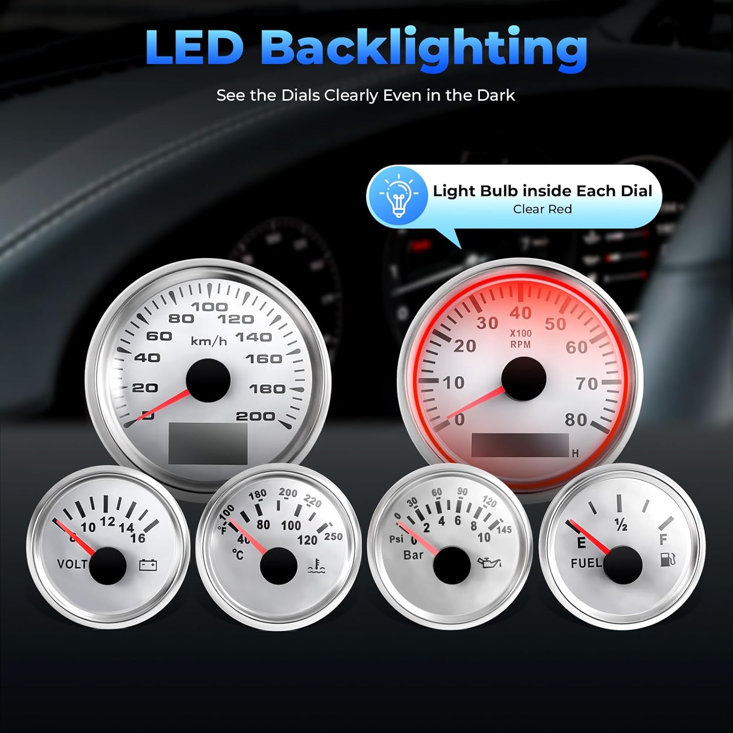 SpecificationsApplicable Models: For 1 to 9-cylinder Gasoline EngineCondition: NewMaterial: 304 Stainless Steel, Plastic, GlassLens Color: ClearPointers Color: RedDial Color: WhiteItems Included: Oil Pressure Gauge, Speedometer, Fuel Level Gauge, Water Temperature Gauge, Tachometer, Volt GaugeSpeed/Tachometer Dial Size (D*T): 85*72mm/3.35*2.83inOil Pressure Gauge, Fuel Level Gauge, Water Temperature Gauge, Voltage Gauge Dial Size (D*T): 52*70mm/2.05*2.76inPower: 9-32VDCSpeedometer Dial: Colorful BacklitDial of the Tachometer, Oil Pressure Gauge, Fuel Level Gauge, Water Temperature Gauge, and Volt Gauge: Red BacklightPackage Size: 34*15*12cm/13.39*5.91*4.72inGross Weight: 1.2kg/2.65lbsNet Weight: 1.14kg/2.51lbsNotes1.We strongly recommend professional installation. 2.Please note that the kit is designed with LED backlighting and each dial is designed with a light bulb inside.3.The tachometer is pinned for easy wiring and installation.4.Please note the tachometer includes #24 and #26 signal filters. The fuel level gauge includes an oil level sensor (240 to 33 ohms). The oil pressure gauge includes the oil pressure transducer (1/8NPT) and 1/8“ NPT female, 45-degree fittings, 1/8” NPT male coupling fittings, and 1/2“ NPT male to 1/8” NPT female adapter fittings. The water temperature gauge includes a water temperature sensor (1/8NPT).Fits (As a Reference)For 1 to 9-cylinder Gasoline EnginePackage Included1* Oil Pressure Gauge1* Speedometer1* Fuel Level Gauge1* Water Temperature Gauge1* Tachometer1* Volt Gauge1* Speed Sensor6 Pairs* Wiring Harnesses6* English Manuals6* Mounting BracketsOther Mounting Accessories