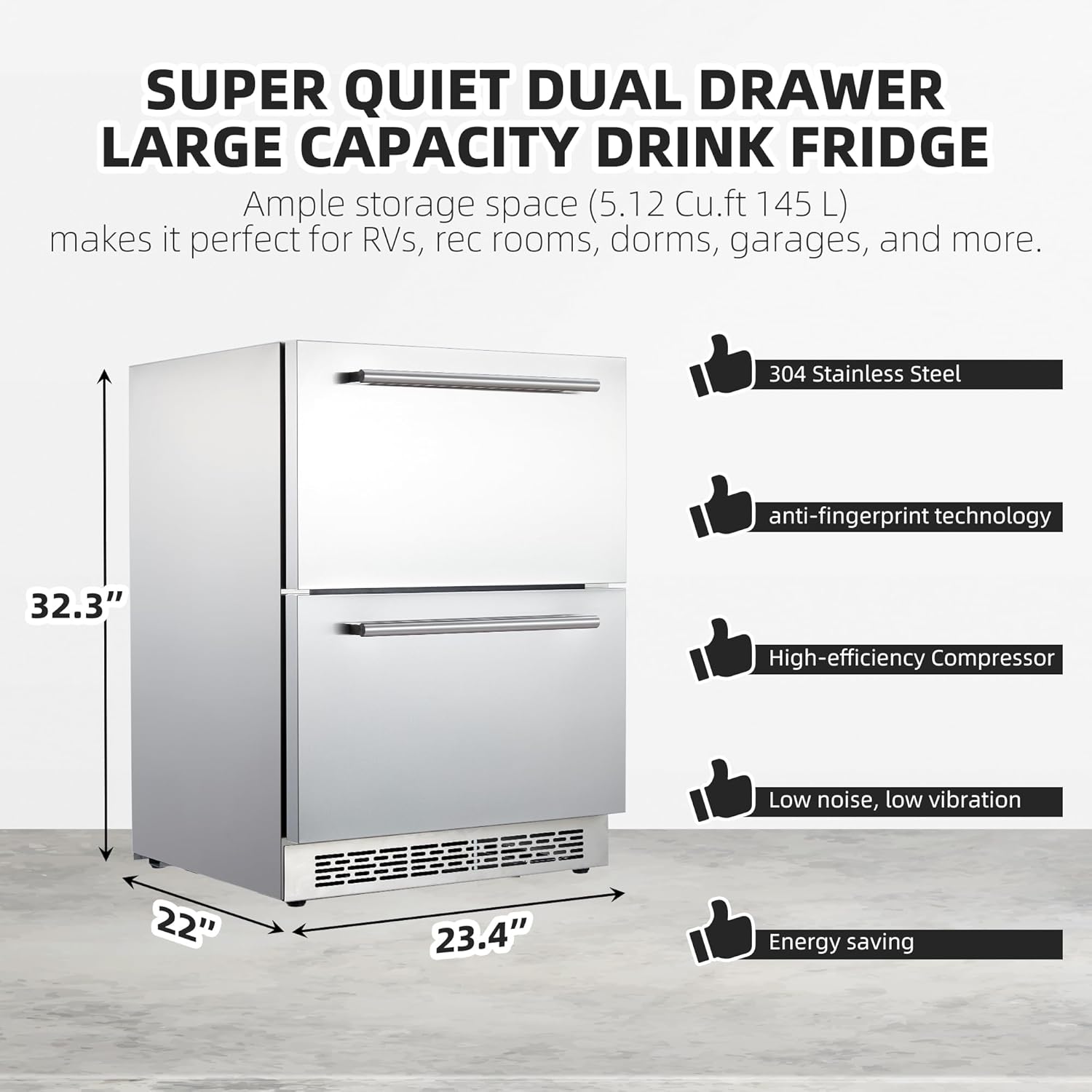 • 🍺【Generous Capacity Drawer Beverage Refrigerator 】With dimensions of 23.4"x 22"x32.3 ", perfectly sized to keep your favorite fruit vegetable, or beverage cool while taking up minimal space in your college dormitory, home, bar, RV apartment garage, or office.