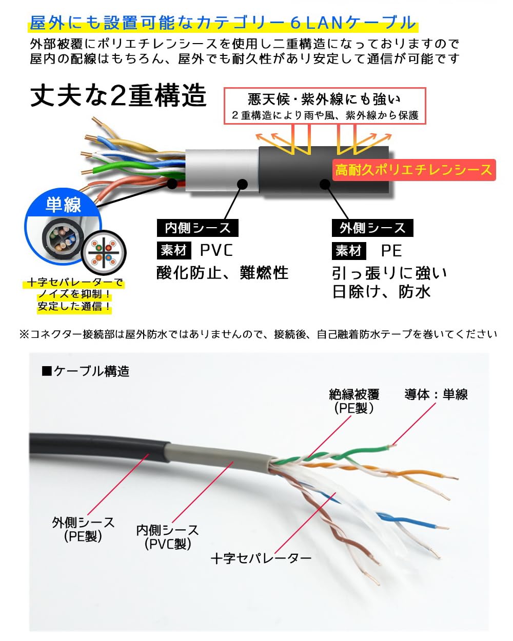 Outdoor Weatherproof Double Shielded Construction, CAT6 LAN Cable for over 30 years of durability, Uses PE coating and noise reduction cross separator for stable transmission. For communication between PoE security cameras, game consoles, computers, hubs, routers, (Cat6) Category 6 1Gbps (250MHz) 1000BASE-TX,1000BASE-T,100BASE-TX,100BASE-T,10BASE-T compatible with TIA/EIA-568-B.2-1 Outer Diameter: Approx. 0.3 inches (7Body: Uses single wire with high noise resistance; 8-core twisted pair cable (with connectors on both ends(RJ45); Cable long lineup: 16.4 ft (5 m) / 32.8 ft (10 m) / 15 m / 20 m / 30 m / 40 m / 50 m / 70 m / 100 m)