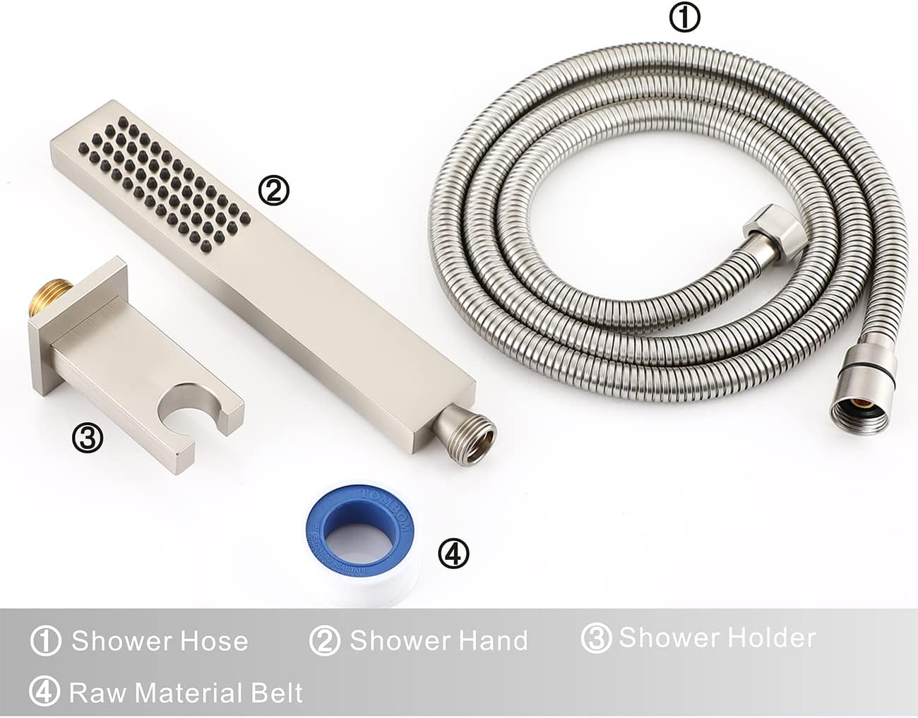 Asyas Bathroom Hand held Shower Wall Mount Copper Square Solid Rainfall Bathtub Shower Spray and Shower Holder with Extra Long 59 Inch Hose, Brushed Nickel Finish Hand Showerhead Shower Head Size: 8.85X1.38X0.59 inches(225X3.5X1.5CM), 1/2 IPS connector (fits most shower hoses) 1.Material: brass 2.Finish: brushed nickel 3. Package 1Xbrass hand shower head 1X brass shower holder connector 1X 1.5M shower hose