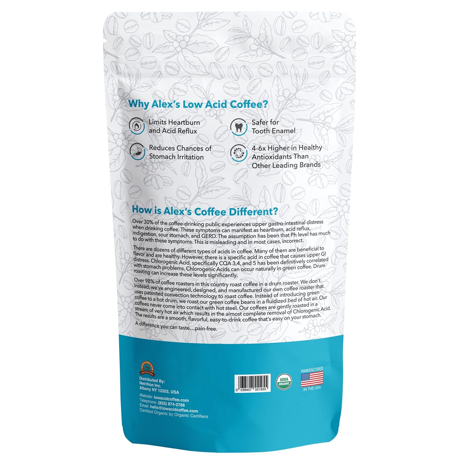 Love coffee, but cannot handle the acid? Alex's Low Acid Organic Coffee is everything good coffee should be: rich, balanced, bright but not acidic, nutty, and aromatic. These organic premium coffee beans are specially processed to contain low chlorogenic acid with full flavor and are free of mold & mycotoxins. Enjoy your morning coffee guilt-free, just the way you like it. No adverse effects of bitter after-bite.