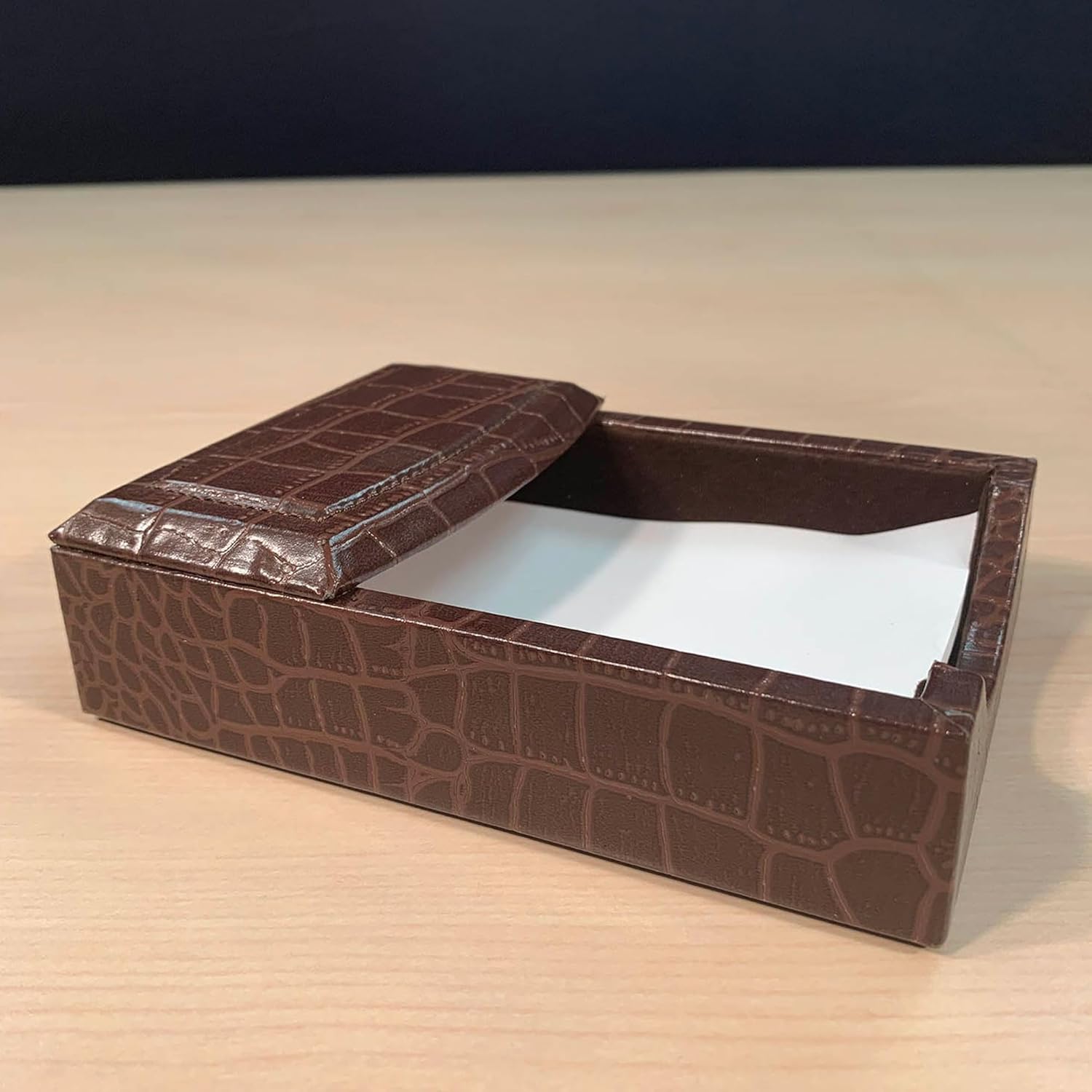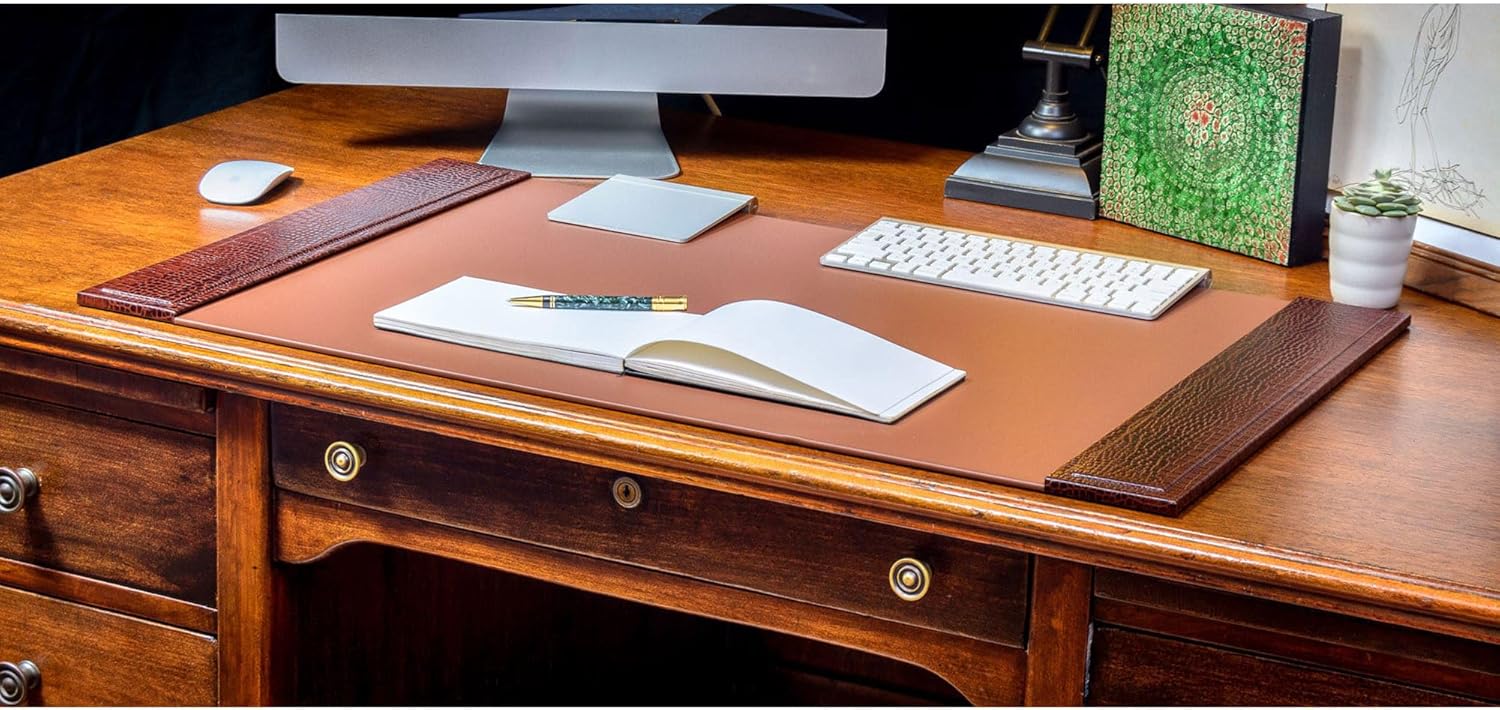 The perfect way to accessorize, protect, and organize your office in style! This complete desk accessory set contains everything you need to outfit your desk. All pieces are made in a lu by urious top-grain leather with a rich crocodile embossed finish. The felt bottoms make all of the accessories safe for your desktop surface, no risk of scratching! This set includes: 34-inch by 20-inch desk pad with side rails, front-load letter tray, pencil cup, 4-inch by 6-inch memo holder, letter holder, business card holder, library set (scissors and letter opener), and double pen stand. Make a style statement in the office with this beautiful matched set!
