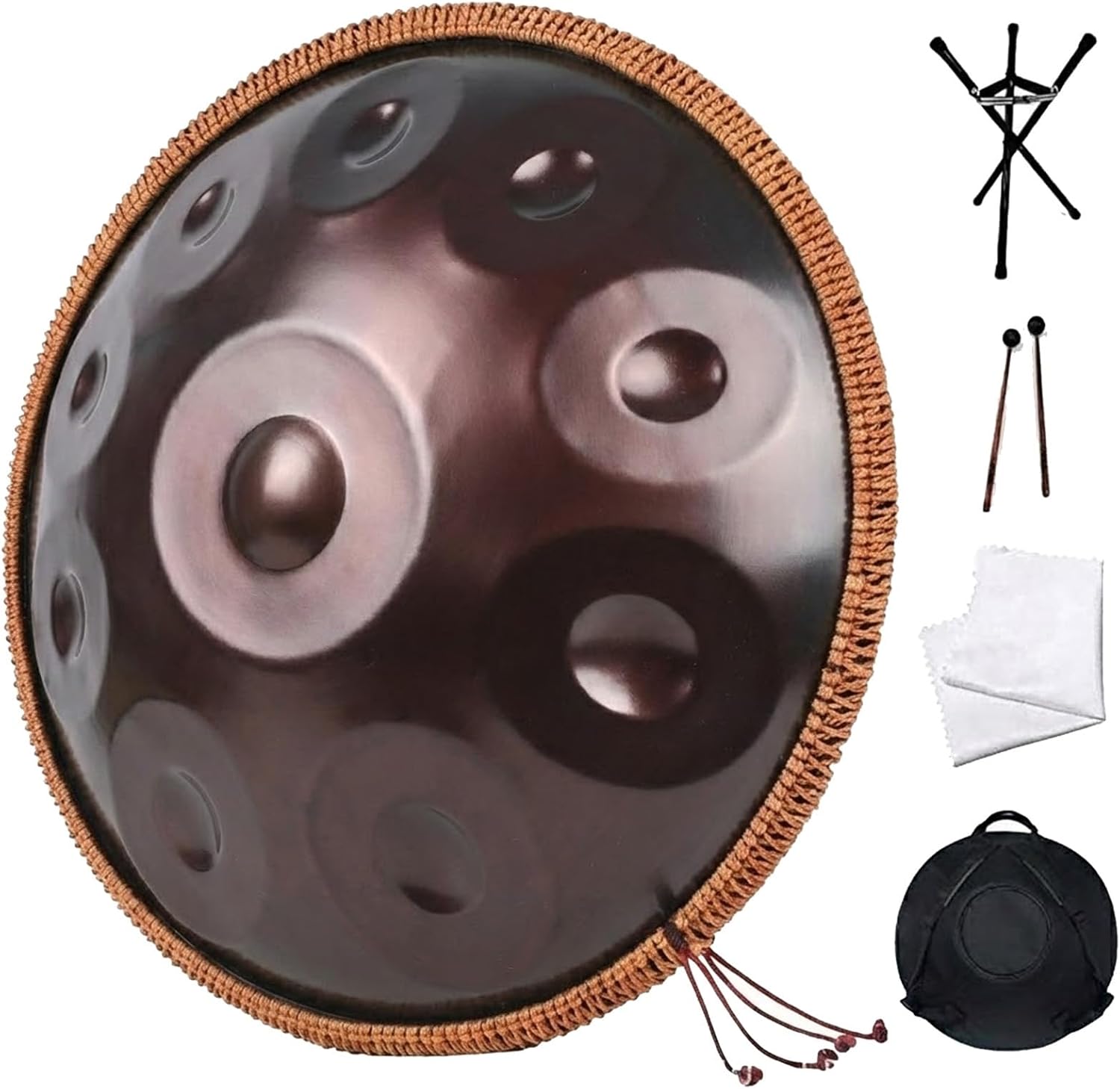 The Sarospan Handpan is expertly crafted from premium stainless steel and hand-tuned for rich, ethereal tones. With 9 notes in G minor, this drum produces a harmonious, soothing sound perfect for yoga, meditation, sound therapy, and musical performances.✦✦✦Specifications:Product Name: Handpan DrumSize: 18 inchesColor: BlackModel: G MinorGross Weight: 5.17 kgMaterial: 430 Stainless Steel (Alloy Steel)Suitable for: Musical Instruments✦✦✦Package List:Drum Bag x1Drumsticks x2Stand x1Cleaning Cloth x1Bracket x1Sound Sticker x1✦✦✦ Note: Before leaving the factory, we apply a layer of edible olive oil to protect the drum’s surface. Any initial odor is normal and will naturally dissipate after a short period