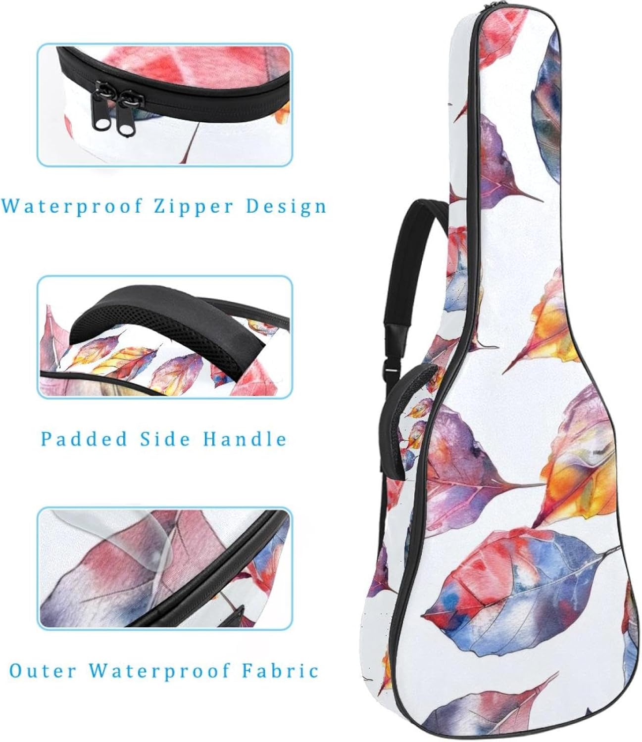 Specifications:Material: waterproof Oxford and waterproof zipper;Size: 42.9’’ x 16.9’’ x 4.7’’, perfect for 40'' 41'' 42'' guitar;Weight:36oz/1020g, lightweight;Color: Multi-color.Features:1. Adjustable backpack shoulder straps and padded side carry handle for more pleasant carrying choices.2. 10mm thick sponge padding inside provide protection for your musical instrument; and fixed Velcro above neck and body keep your acoustic guitar bag safer.3. This guitar bag comes with back hanger loop can be hung on the wall. Save more space when not in use.4. Two pockets for storage convenience, 1 large capacity pocket on outside back and 1 small pocket on the inside neck.5. Cute printed guitar gig bag guitar case backpack, ideal as a gift for your relatives or friends who love music when birthday, Thanksgiving, Christmas, holidays, and other special events.