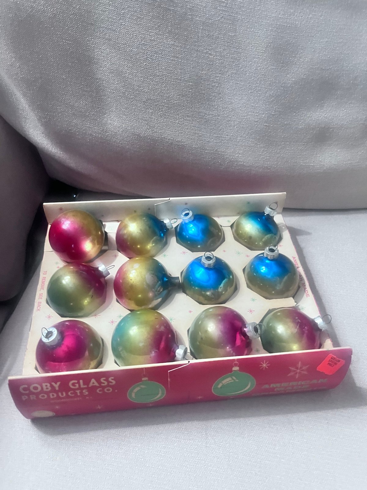 Last Set Vintage Christmas Patriotic Colors Ombré Set 12 Ornaments. Review all pictures as these are vintage 1950’s some paint missing in areas from usage.