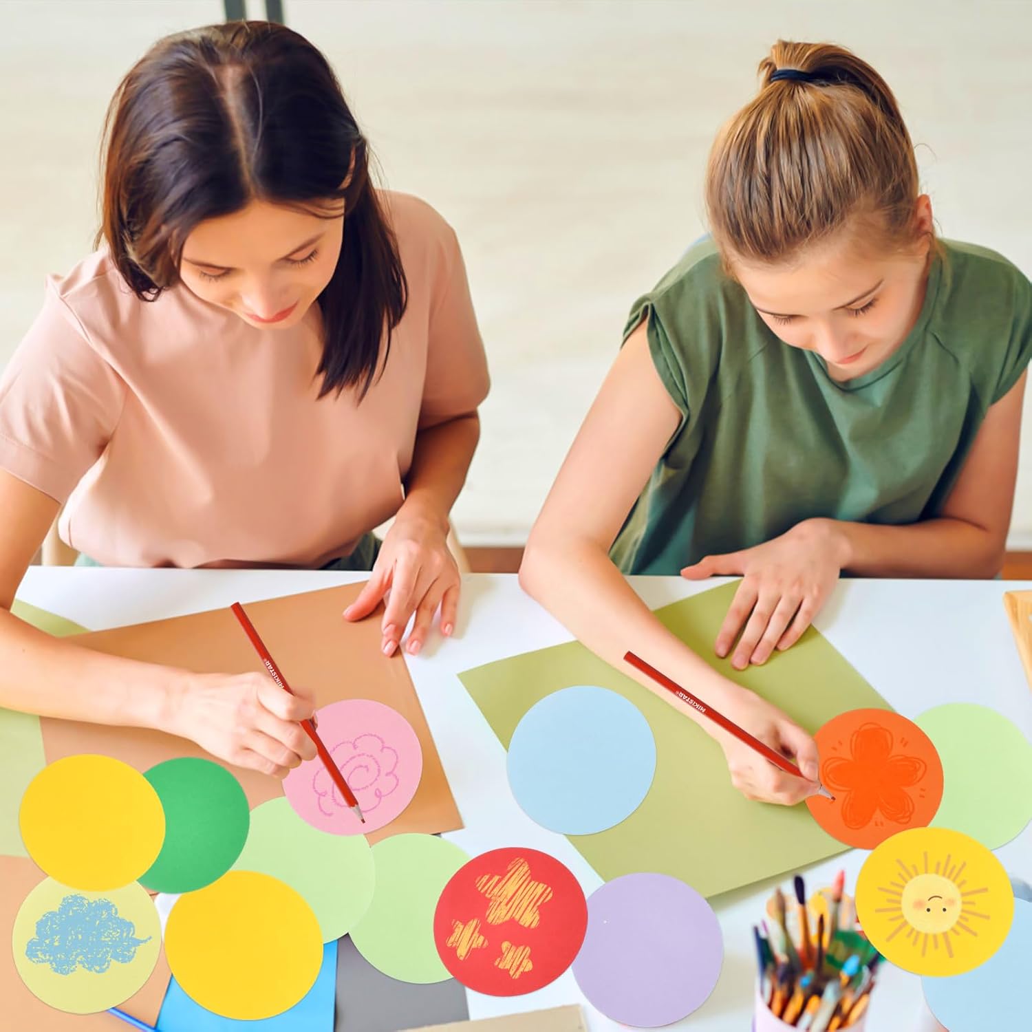 Unleash Creativity with Our Ultimate Classroom Craft Bundle! Teachers love how the colorfast sheets maintain brilliance through seasonal classroom theme changes, from Black History Month exhibits to Earth Day awareness boards. Ideal for DIY enthusiasts crafting wedding table numbers, or personalized Christmas ornaments. The precision laser-cut edges ensure professional-looking scrapbook page elements, vision board components, and homeschool geometry manipulatives. Package: 1000×Round Cutouts Paper 18×Colored Pencil Specifications: Material: paper Color: deep green, mint green, lavender, tangerine, buttercream, sunflower yellow, powder blue, sky blue, blush pink, cherry red Size: diameter 3.9inch/10cm IMPORTANT: 1. Please check the package if it is in a good condition. 2. Our all items are come with 180 days free after-sale service, if you do have any questions please feel free to contact us!