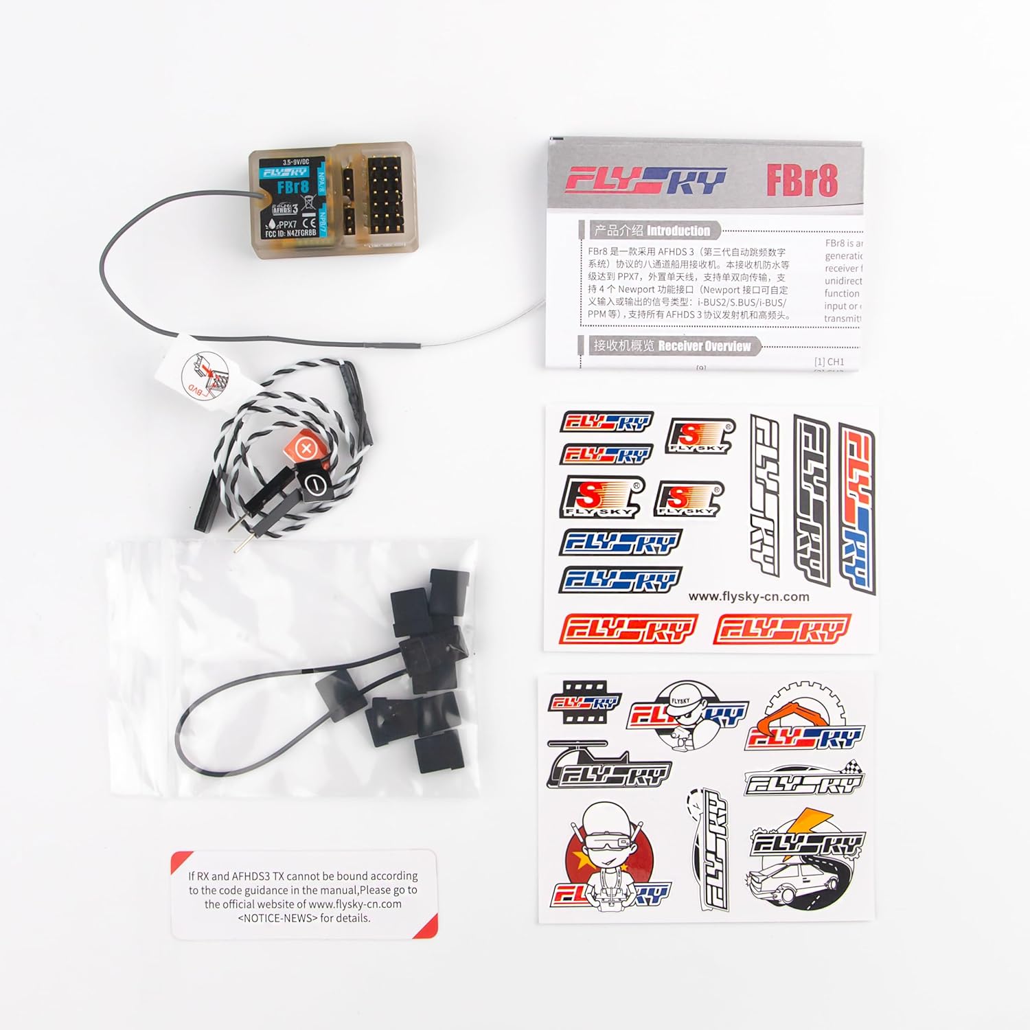 Product Model: FBr8 Adaptive Transmitters: Transmitters or RF Modules Which Support AFHDS 3 Protocol Adaptive Models: Car or Boat PWM Channels: 8 RF: 2.4GHz ISM 2.4G Protocol: AFHDS 3 Antenna: Single External Antenna(Coaxial Antenna) Maximum Power: <20dBm (e.i.r.p.)(EU) Distance: ≥ 300m(Ground Distance without Interference) Input Power: 3.5~9V/DC Working Current: ≤ 50mA/5V Data Output: PWM/PPM/i-BUS2/S.BUS/i-BUS Resolution: 4096 Temperature Range: -10℃ ~ +60℃ Humidity Range: 20% ~ 95% Online Update: Yes Dimensions: 37*23*13mm Waterproof: PPX7 Weight: 14g (Without Pin Header) Certifications: CE, FCC ID: N4ZFGR8B