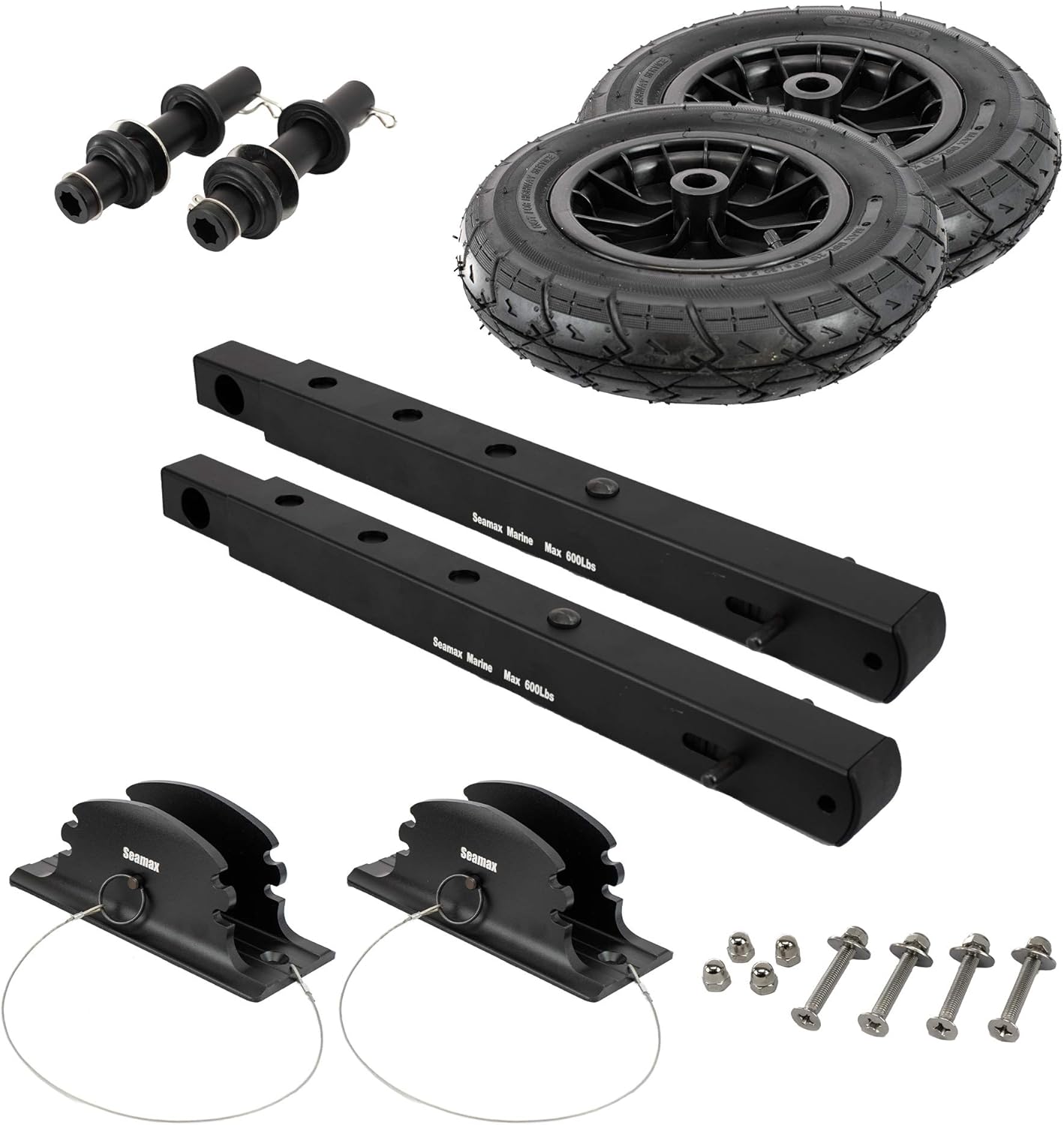 Seamax Military Version Deluxe Boat Launching Wheel System is an upgraded version in our Seamax dolly family. It is military-grade with All Black design and with upgraded component. Originally standard version designed with 3D-work by Seamax Marine back in 2011, Now this military edition released in 2021. If you are looking for the best launching dolly system with a classic military style instead, we highly recommend this Seamax Military-Grade Outdoor Deluxe Boat Launching Wheel System. Besides its strength, this one has a premium look and elegant design for military fan. Seamax Deluxe Boat Launching Wheels system is made by the marine grade T6 aluminum alloy with CNC processing and shiny looking anodized coating against the corrosion. Thus, the product is good for saltwater use. Small parts are all made by solid stainless steel and reinforced Nylon. The air-filled tire is lab-tested (1000 LBS), and is great to support a MAX loading of 600 LBS in all condition. A great add-on for inflatable, aluminum, and fiberglass boats.