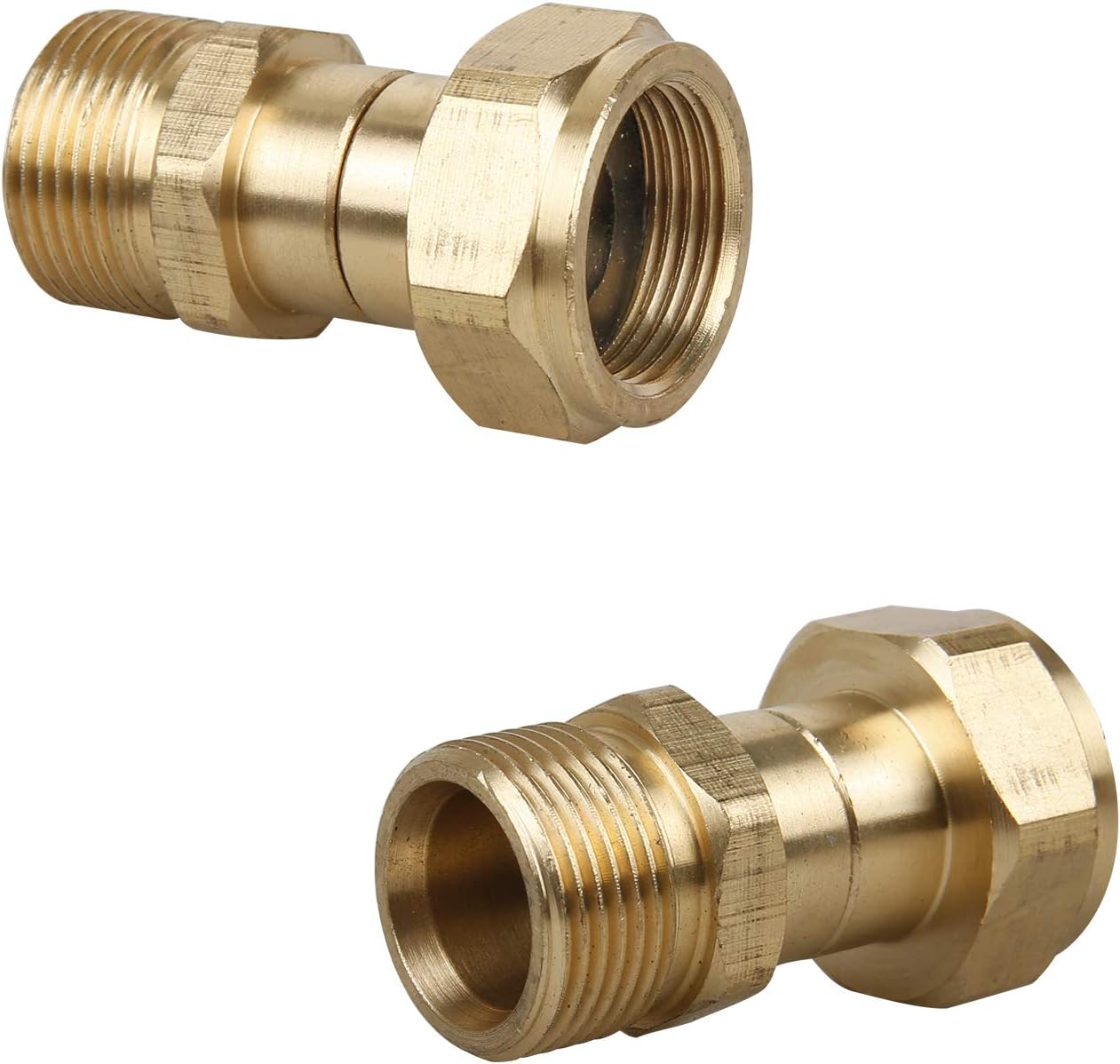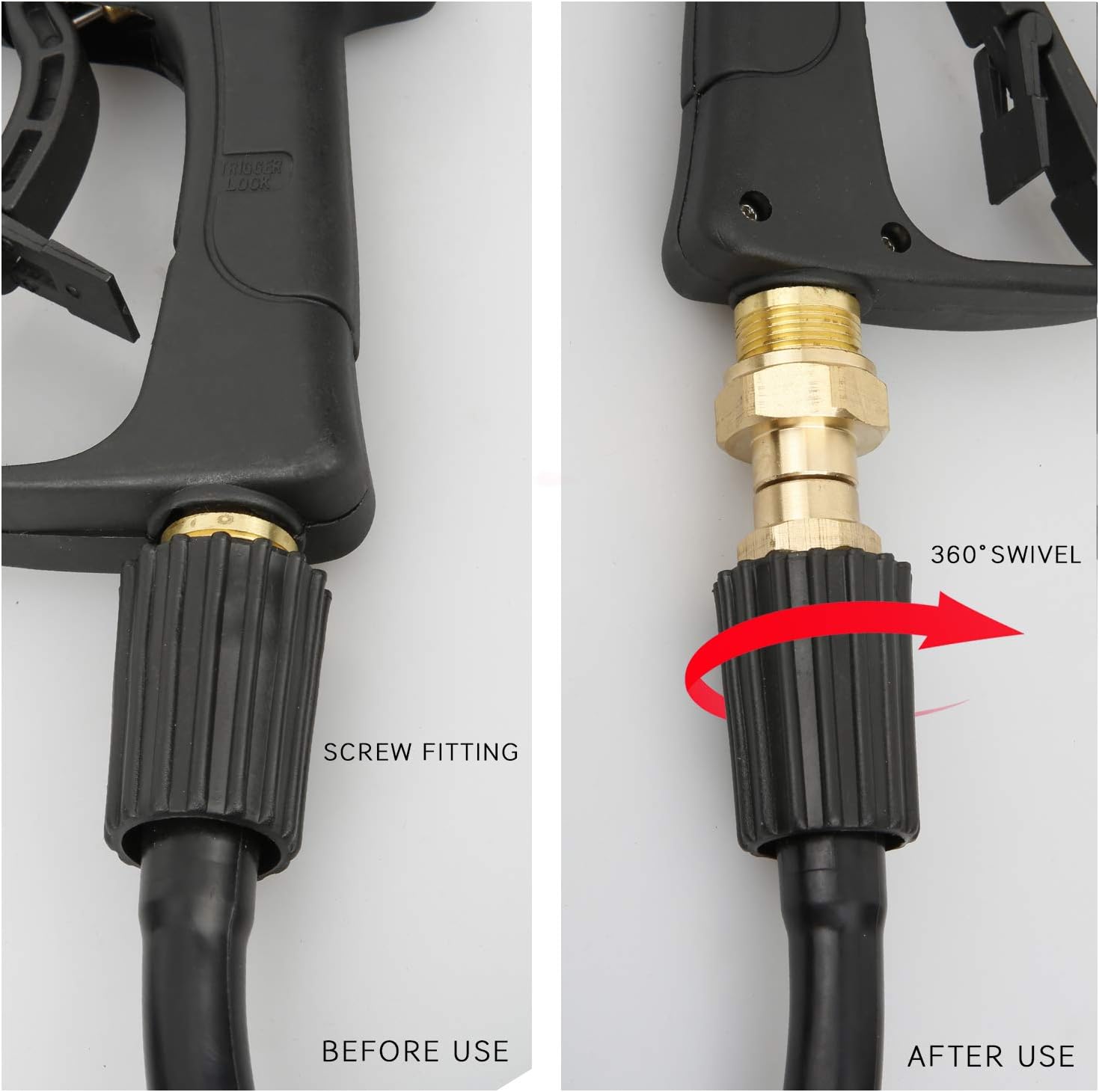 The gun body is made of engineering plastic, internal structure is brass and stainless steel, which is strong and durable.Not afraid of leaks. Ensures working normally at 3000PSI Maximum. Working pressure is up to 3000 PSI and working temperature is up to 140 °F. Tangle free pressure washer coupler is made of high quality brass, resistance to corrosion. The safety buckle on the handle is designed to enhance work safety, and prevent accidental spraying. Kink free swivel joint for power washer. Prevent hose twist and no kink when spraying. The short pressure washer gun with 1/4 inch outlet quick disconnect fitting,which can connect with nozzles, extension wand, foam cannon, etc. M22-14 Thread inlet fitting. Easy to install and remove. Kink free swivel joint connects gun to hose or hose to hose. 360 degree rotation. Reduces stress on the gun, hose and operator. M22 14 swivel fitting has 14mm inside diameter,if the washer fitting is 15mm,it may cause leakage.Not compatible with Sun Joe, Campbell, MI-T-M, AR Blue, Stanley, Cleanforce , Simoniz which have M22 15mm fitting.