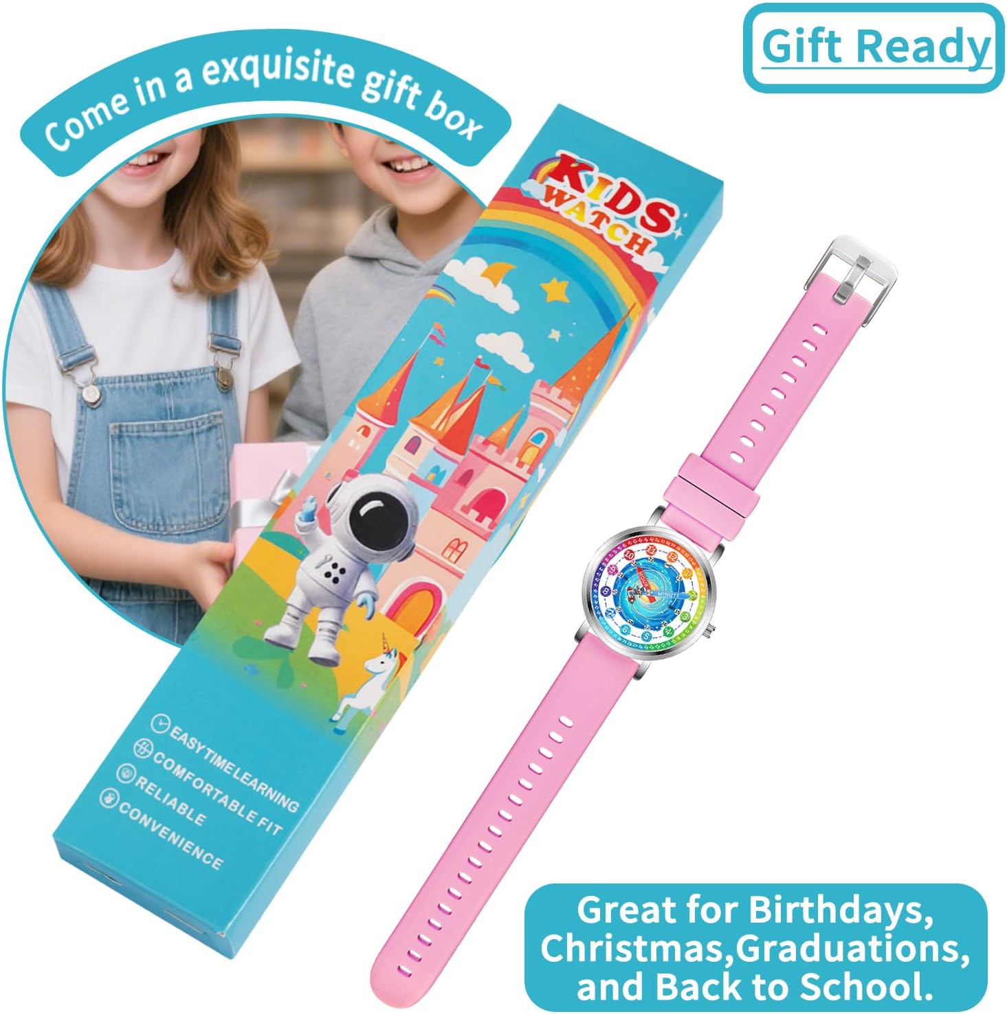 Featuer: Easy time learning - Afcrho kids watches make learn to tell the time easy and fun. Watch hands are labeled "HOUR" and "MINUTE" and pointed for accuracy. The colorful dial shows all minute numbers making it easier for children to read time. Comfortable fit - high quality soft silicone watch band with 17 HOLES for ultimate adjustment, provides a comfortable fit for children having wrist circumference between 5.3" and 8.3". Buckle with SNAG-FREE design: hollowed in the middle with a rounded-edge pin. Reliable - scratch resistant mineral crystal glass front, precise mechanism paired with long lasting battery, packed in a SHOCK RESISTANT alloy case with STAINLESS STEEL back guarantee a worry free and long lasting use. Water resistant to 3 ATM (100 feet, 30 meters) - kids watches withstand occasional splashes, hand wash or rain. We do recommend removing them during a shower or swim to avoid damage. Great gift for any occasion - like birthday, back to school or Christmas. Watch band's QUICK RELEASE feature makes strap changing a breeze and kids can style their own watch by mixing and matching different straps. Package: 1 watch 1 gift box