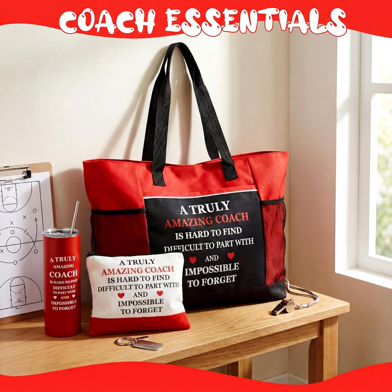 Features: For your Coach Gifts: This gift for coach set is suitable for cheer, dance, basketball, soccer, baseball, or any female coach who made a difference, whether you're a coach's family or a friend. It's an ideal gift set. Vibrant Colors: This red gift set for coach symbolizes a smooth and successful future, a nice way to send your blessings to your coach. Specifications: Material: canvas, stainless steel, metal Color: red, black, white Size: Tote Bag for coach is 17.72 x 13.39 x 5.91 inches/ 45 x 34 x 15 cm Makeup Bag is 7.09 x 9.06 inches/ 18 x 23 cm Stainless tumbler is 20oz Package includes: 1 x Tote Bag 1 x Makeup Bag 1 x Keychain 1 x Stainless tumbler with straw and lid Notes: Manual measurement, please allow slight errors on size. The color may exist a slight difference due to different screen displays