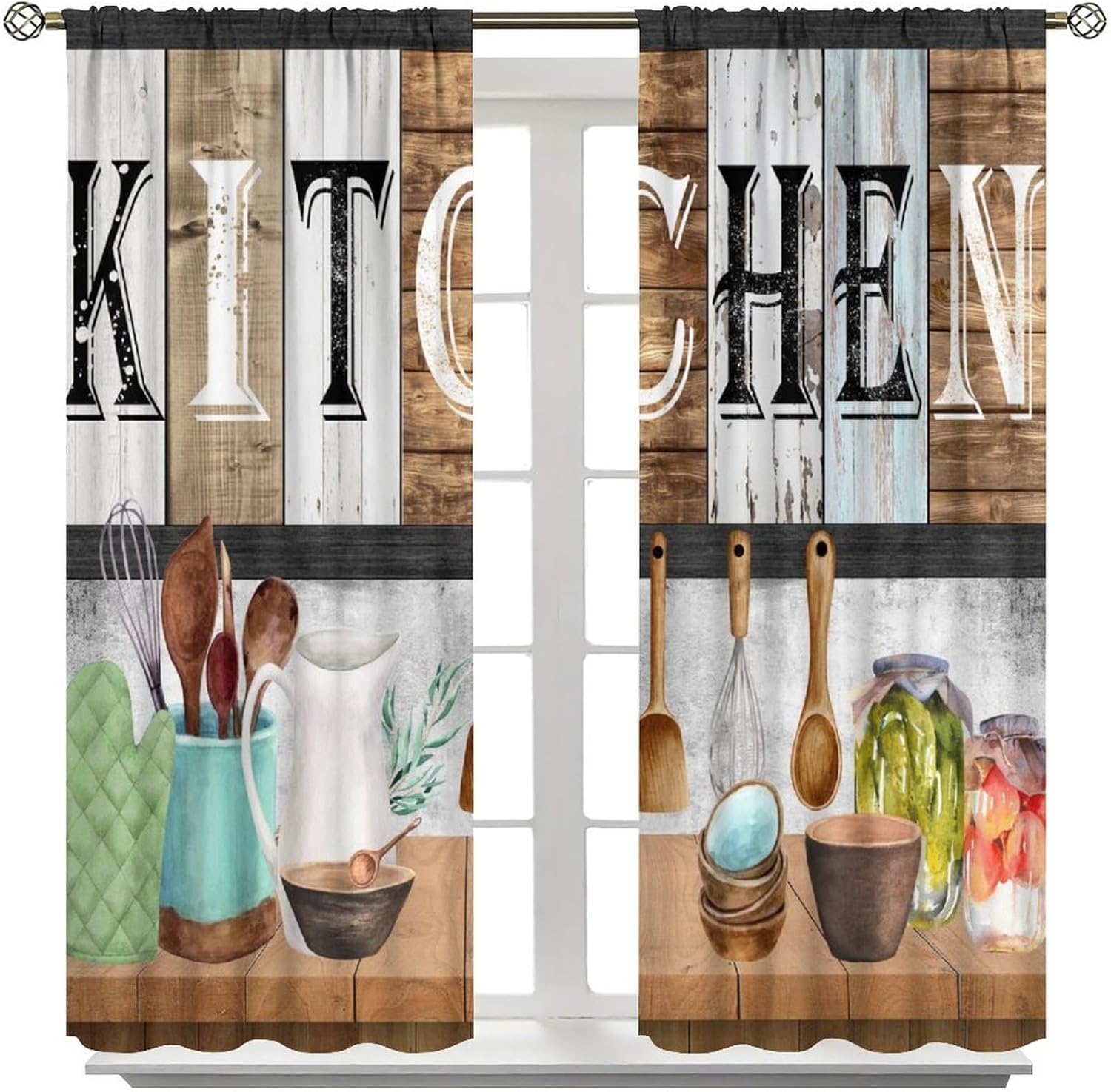 Rustic Kitchen Blackout Curtains Cook Country Vintage Farmhouse Fork and Spoon Wooden Plank Board Windows Treatments Rod Pocket for Cafe Dining Room Living Room Bedroom 42X45in