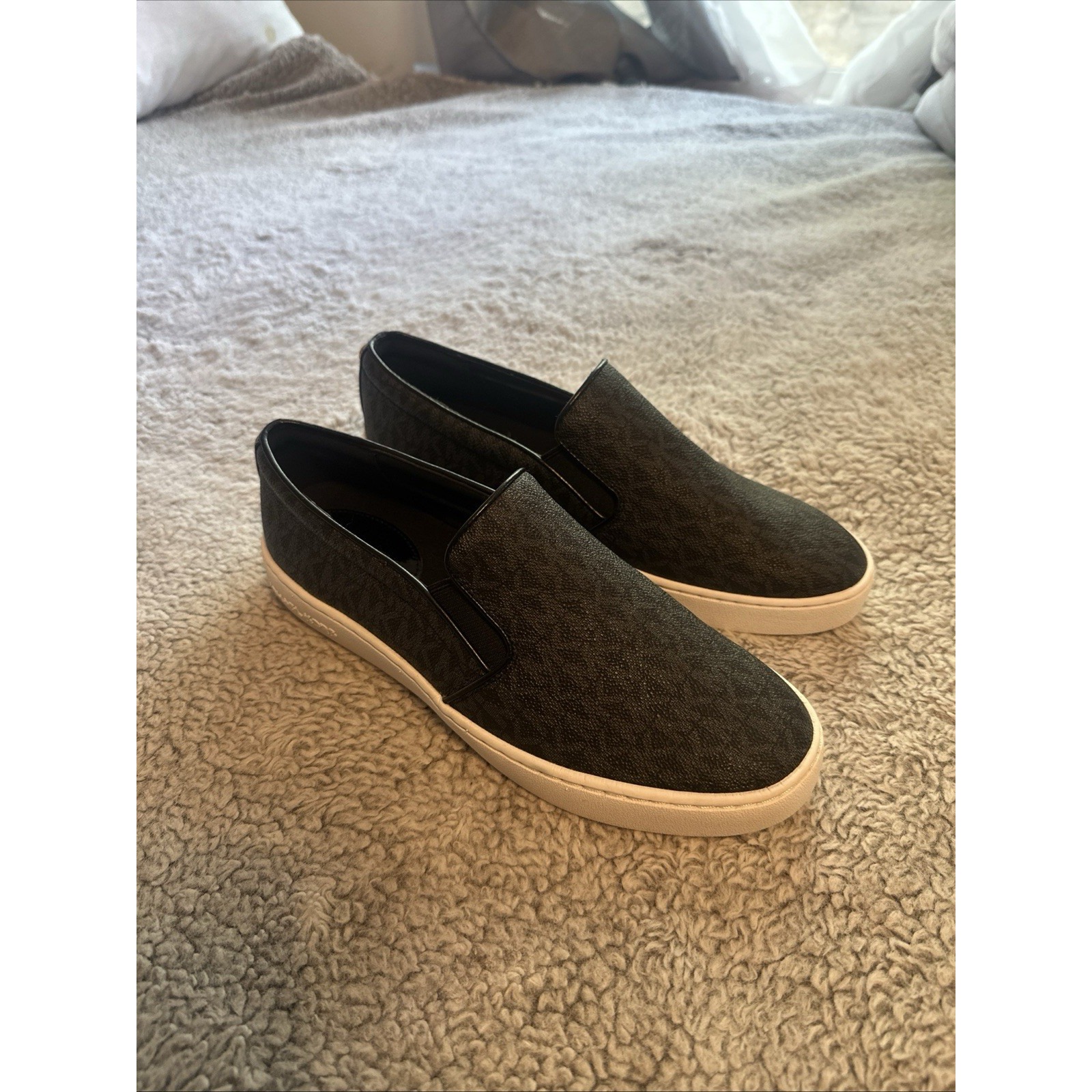 The product is a pair of MICHAEL Michael Kors Women's Keaton Slip-On sneakers in size 8.5, featuring a low top design and a solid black color with lace accents. Made from PVC/rubber fabric, these athletic shoes are perfect for casual occasions in the spring season. With the iconic Michael Kors logo and a cross theme, these sneakers offer a stylish and comfortable option for women looking for a fashionable shoe.