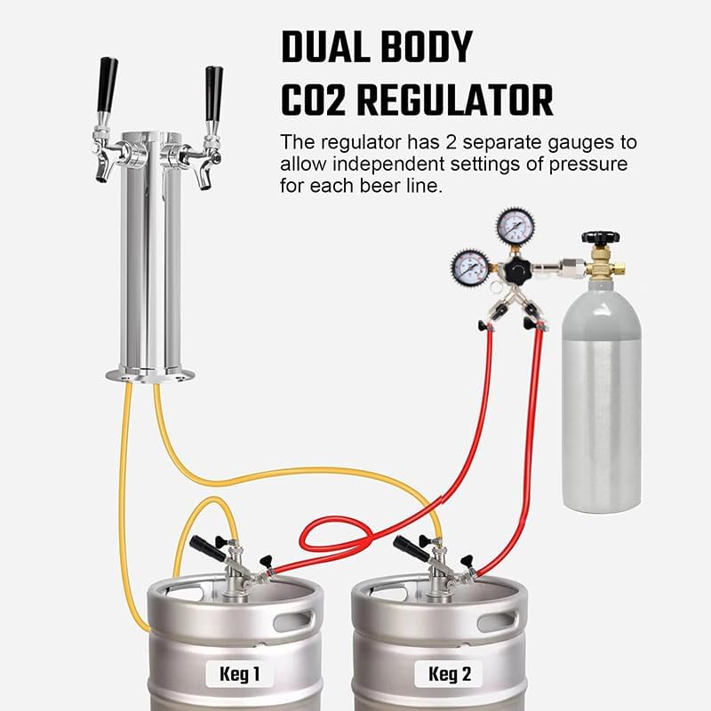 A premium stable Co2 regulator could help you to finding the perfect Co2 or Nitrogen pressure which helps ensuring a smooth pour and reduce foam problem.DESCRIPTIONS:Material: chrome-plated brass bodyType: W21.8-14 / CGA-3205/16" output barbs: Available for most 8mm inner diamter pipe hose0-3000PSI Gauge: For measuring the pressure in the tank0-60PSI Gauge: For measuring the output pressure.Internal pressure relief valve that releases at 50Psi automitical. It supports manual pressure reliease too.PROS:High-quality materials that ensure long-lasting performance and durability.Two-output design allows you to simultaneously dispense two beer kegs at the same pressure.Easy to install and use .With this regulator, users can enjoy perfectly carbonated beer every time they pour.==========Hign-concerned Chemical : NoneProduct Type : Carbonation EquipmentMaterial : Stainless Steel