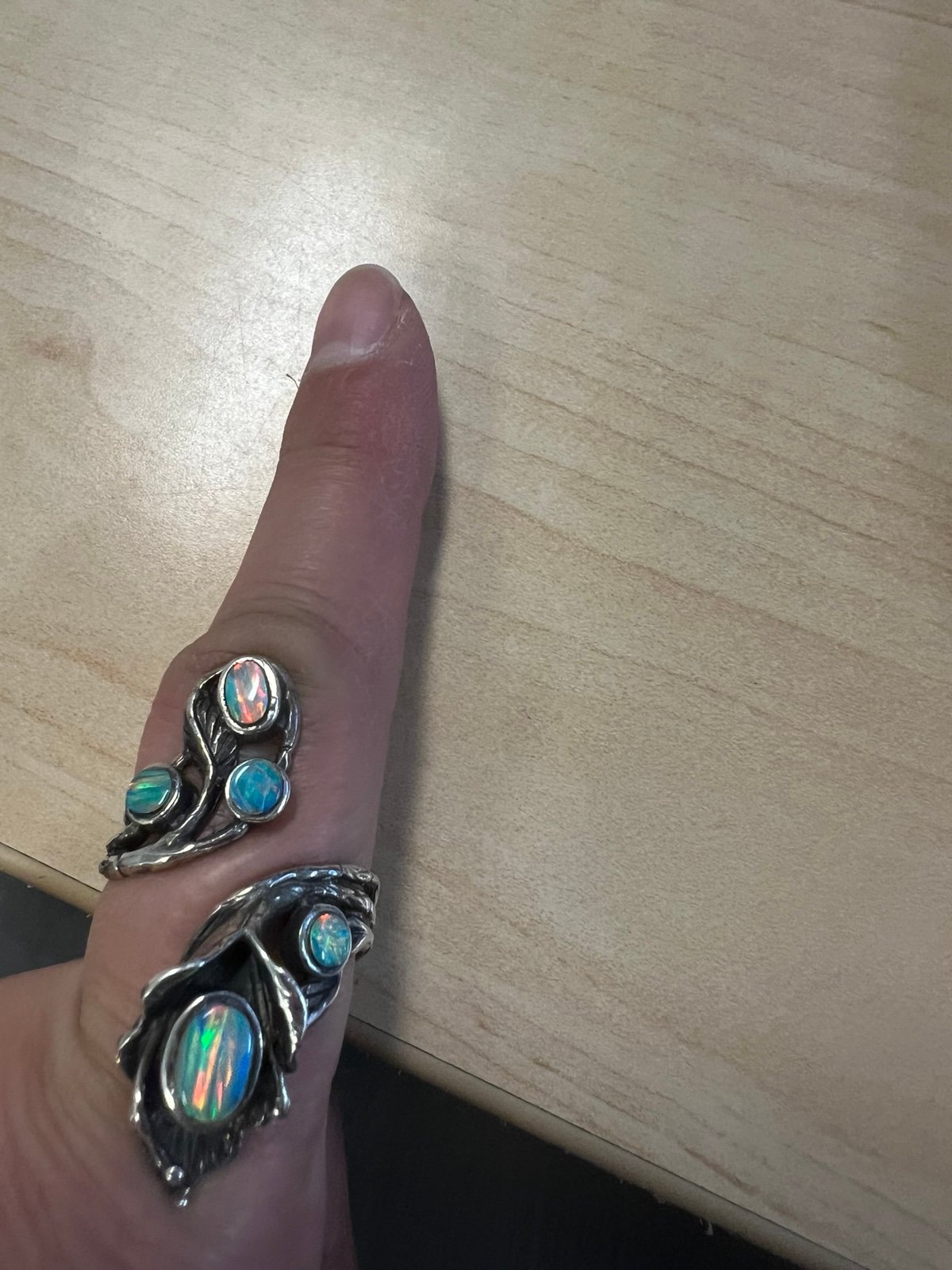 A FINE SOLID SILVER & REAL OPAL SET ART NOUVEAU DESIGN RING, VERY IMPRESSIVE WHEN WORN, THE DIFFERENT SIZE 5 OPALS SET IN A NATURALISTIC ART NOUVEAU DESIGNED SOLID SILVER MOUNT. IS NOT JOINED SO CAN BE SLIGHTLY ADJUSTED TO SIZE. HIGH AND SITS VERY COMFORTABLE ON FINGER.LOOKS STUNNING WHEN WORN.p