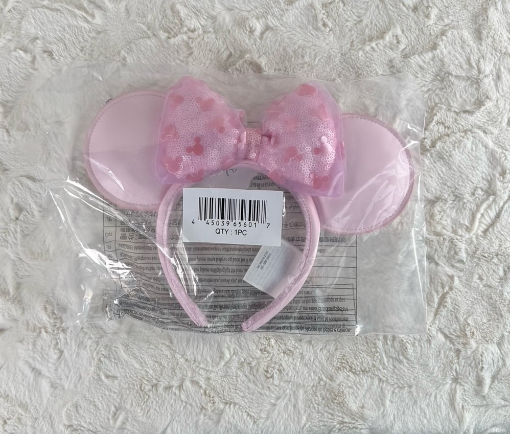 • Pale pink sequined bow with sheer organza overlay and metallic Minnie icons
