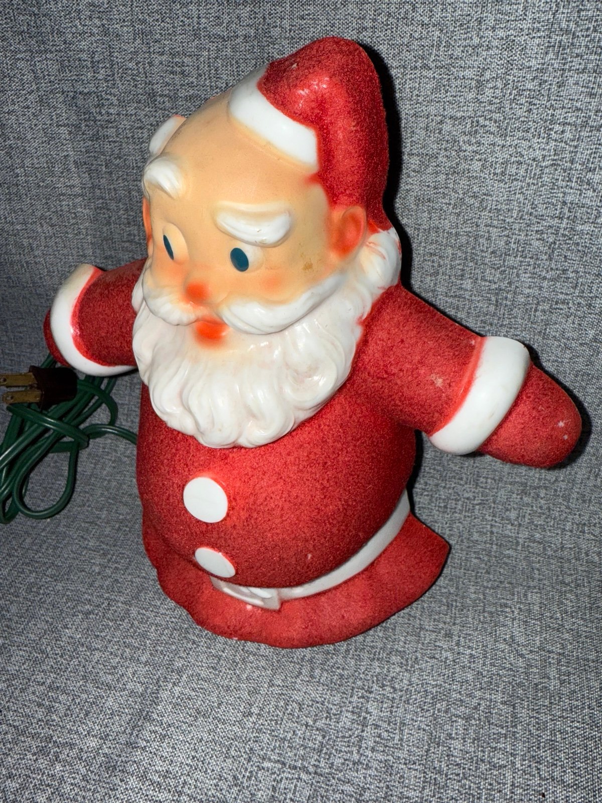 Vintage Santa Glo Christmas Tree Top Wall Plaque Light Original Box. Complete with lamp and cord. Hard plastic Santa Claus flocked red. Great working condition. Very small piece chipped on the back side of one of his hands can only be seen when looking closely at the back side and a few spots of wear on his coat. Could use a light cleaning. Front piece of box is not connected, otherwise great condition and fantastic graphics Very hard to find Christmas light!