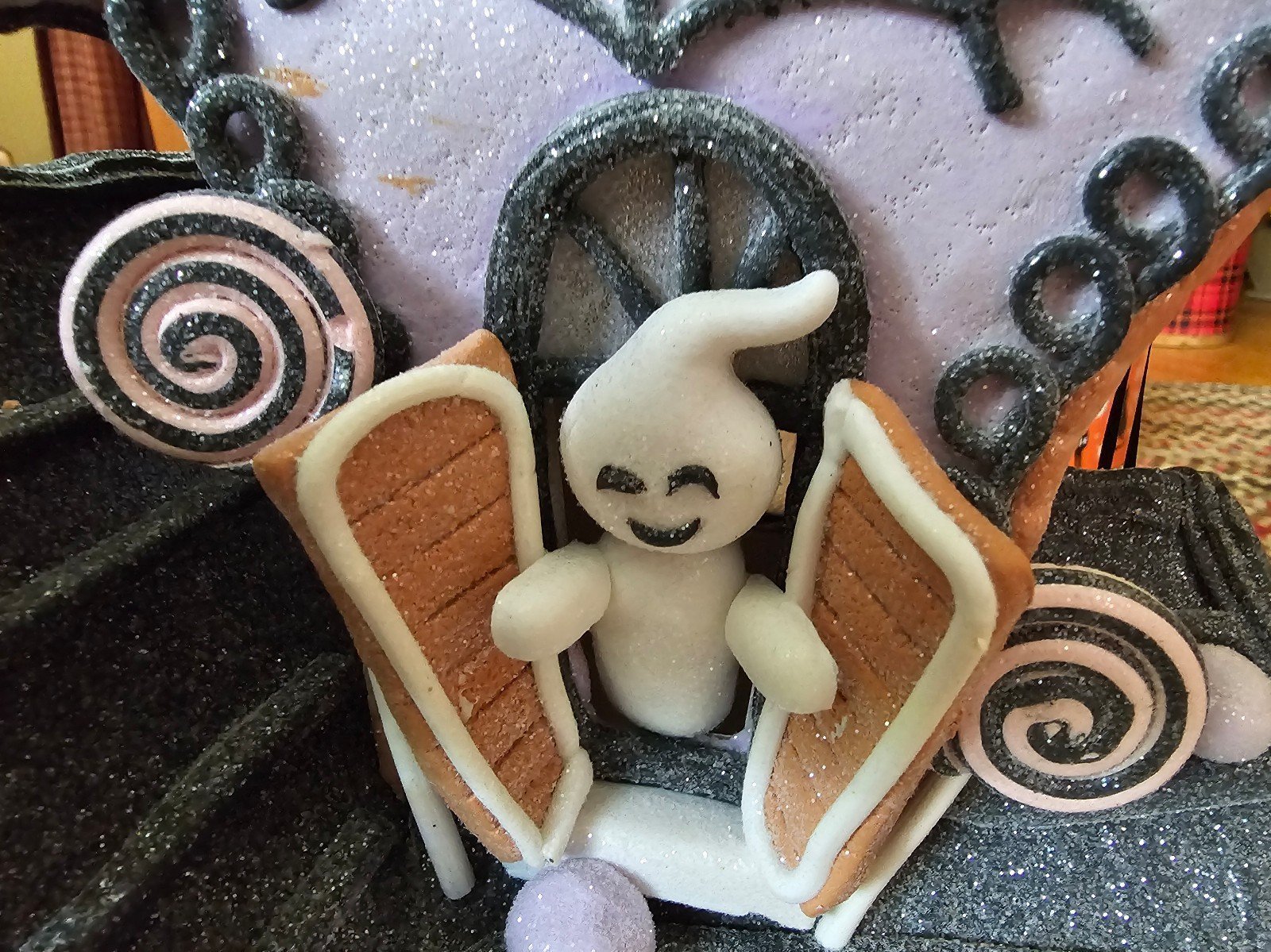 This large 18-inch Halloween gingerbread house is adorable. The details are amazing and the festive lavender, black & white colors are perfect for Halloween or Summerween. Complete with a ghost & black cat. Measures 18 inches high x 12 inches wide x 9 inches deep. This is a great unique piece to add to your Halloween or gingerbread collection!