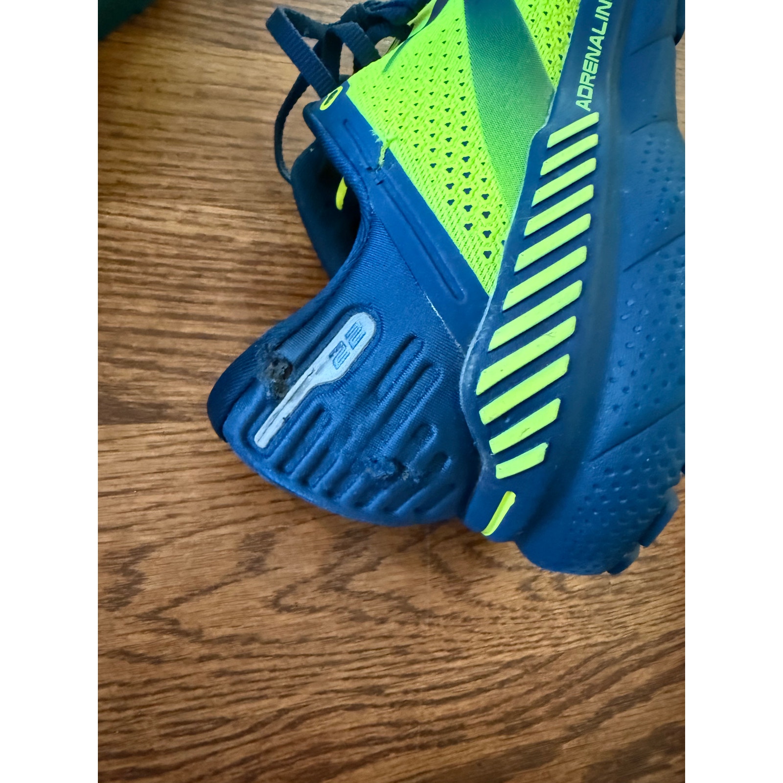These are unused except some dirtying of soles from try-on's, but no wearing down of soles. There is some tearing of the fabric at the back of right heel, as seen in pics.
