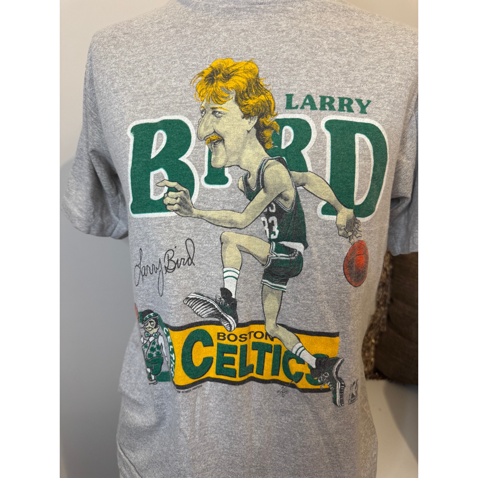 This vintage Larry Bird Boston Celtics T-shirt is in good condition for its age, with minor wear. It has been well-preserved and is ready to be worn or displayed. Perfect for casual wear, sports events, or as a collector's item. Don't miss out on the chance to own a piece of basketball history! Grab it now and add a touch of nostalgia to your wardrobe.