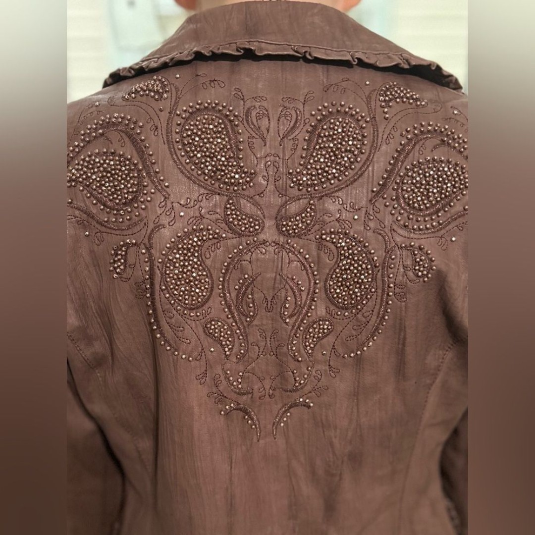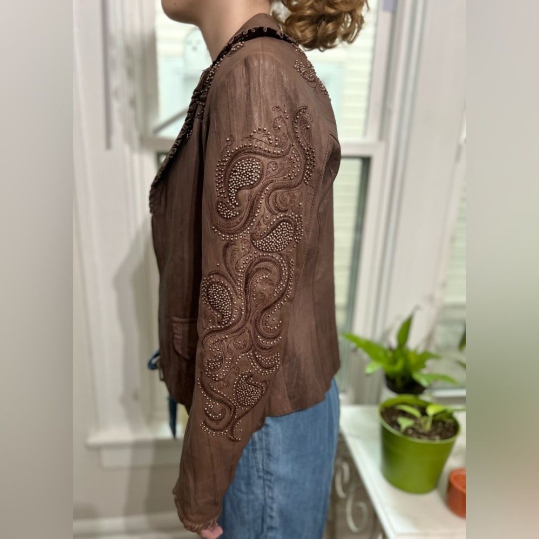 Blanc Noir Brown Leather Vintage Y2K Beaded Embroidered Jacket Ruffles Sz Large
