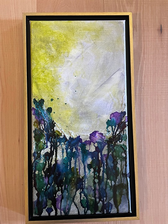 Original 10” x 20” Fluid Art acrylic Paint on a stretched canvas and framed on an open back open frame.