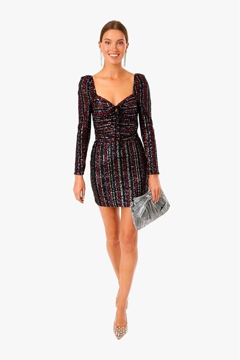 A striped sequin mini? Say no more. The Multi Didion Dress is a long sleeve stunner with a mix of black, pink, red, and purple sequins. With a keyhole cutout and ties that can be done around your neck or together in the front, this versatile style is ready to dance the night away. Just add statement earrings and a clutch for a glamorous look that is sure to turn heads.