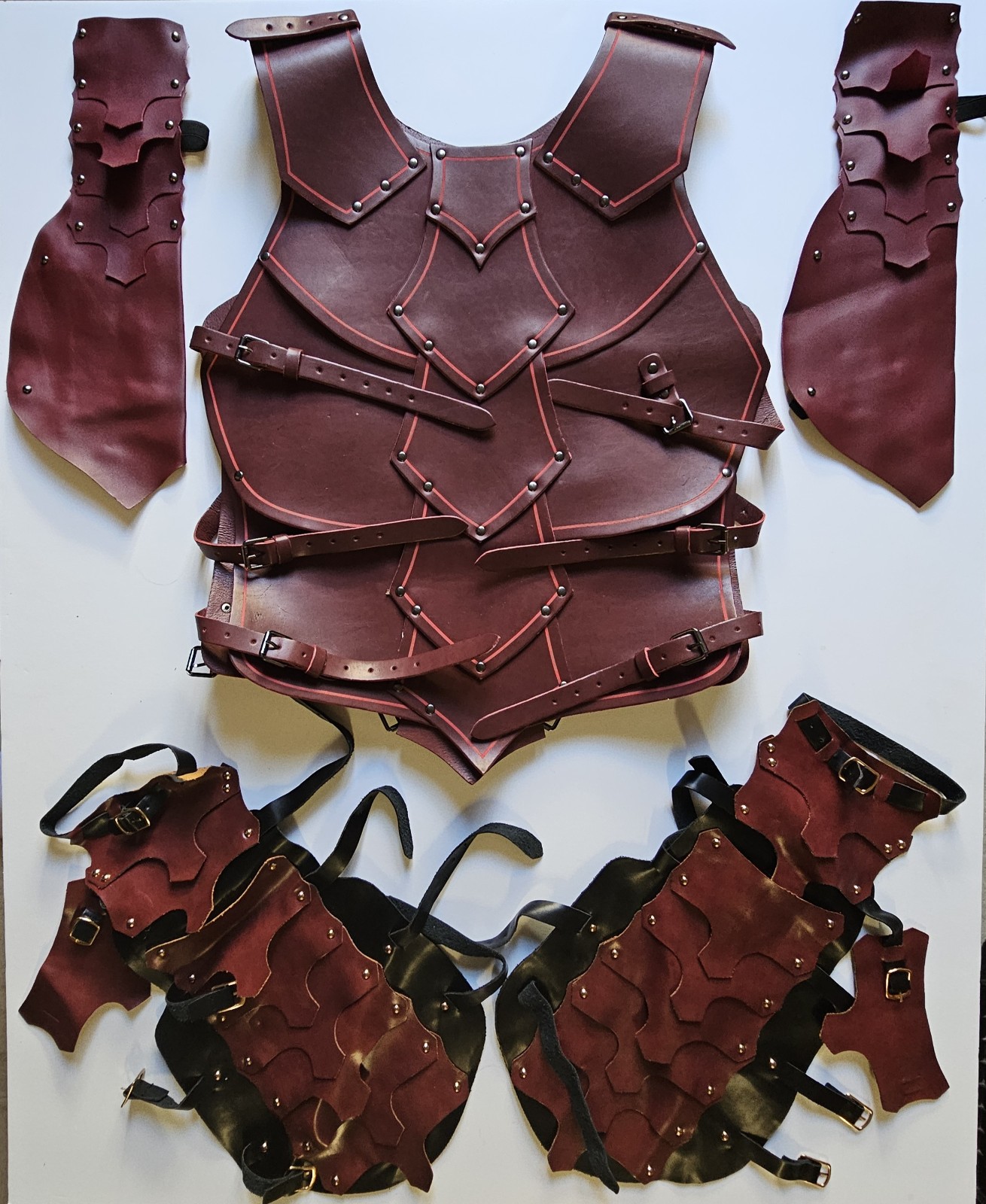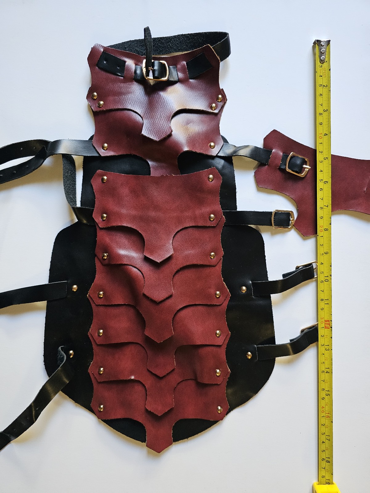 This Medieval LARP Gladiator 5-piece Red Leather Armor Vest, Leg & Arm Gaiters is a vintage reproduction piece perfect for those interested in medieval themes. Made of leather and faux leather, this ambidextrous armor set includes a chest, leg, and arm piece in a wine red color. With a one-size regular fit, this unisex costume is ideal for reenactments, theater performances, or cosplay events where a touch of historical flair is desired. Made in China, this unique and authentic armor set adds a touch of elegance and authenticity to any outfit.