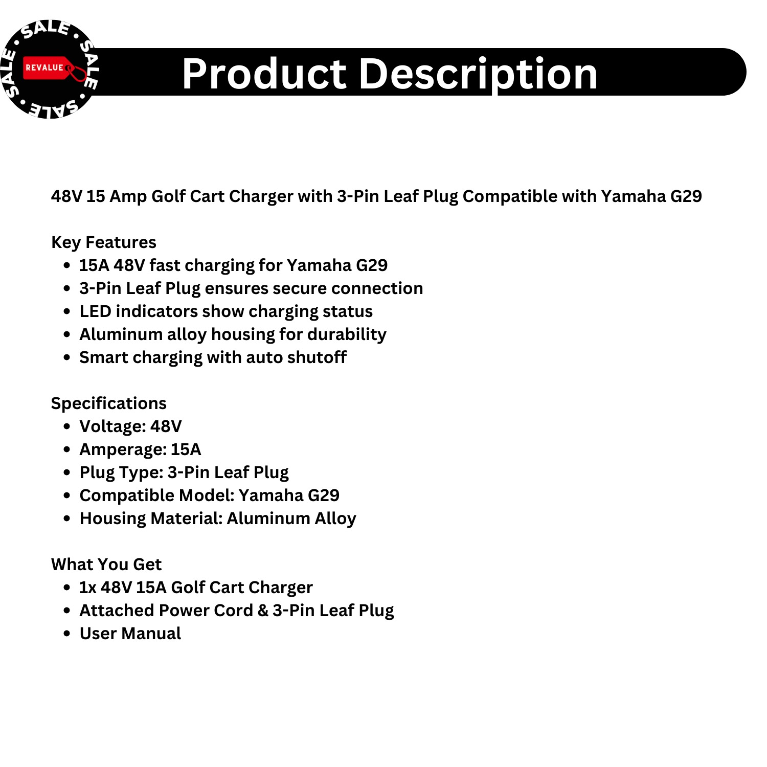 15 AMP 48 VOLT GOLF CART BATTERY CHARGER FOR YAMAHA G29 WITH 3-PIN LEAF PLUG