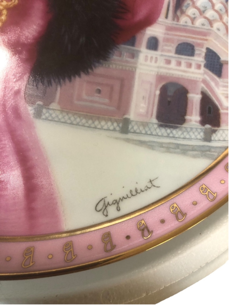 This is a set of six porcelain plates featuring Barbie dolls in various settings. The plates are round and measure approximately 7 inches in diameter. Each plate features a different Barbie doll, dressed in a different outfit and posed in a different setting. The plates are decorated with colorful images and gold trim. The plates are in new condition and come in their original boxes. The plates are made by The Danbury Mint and are limited edition pieces.