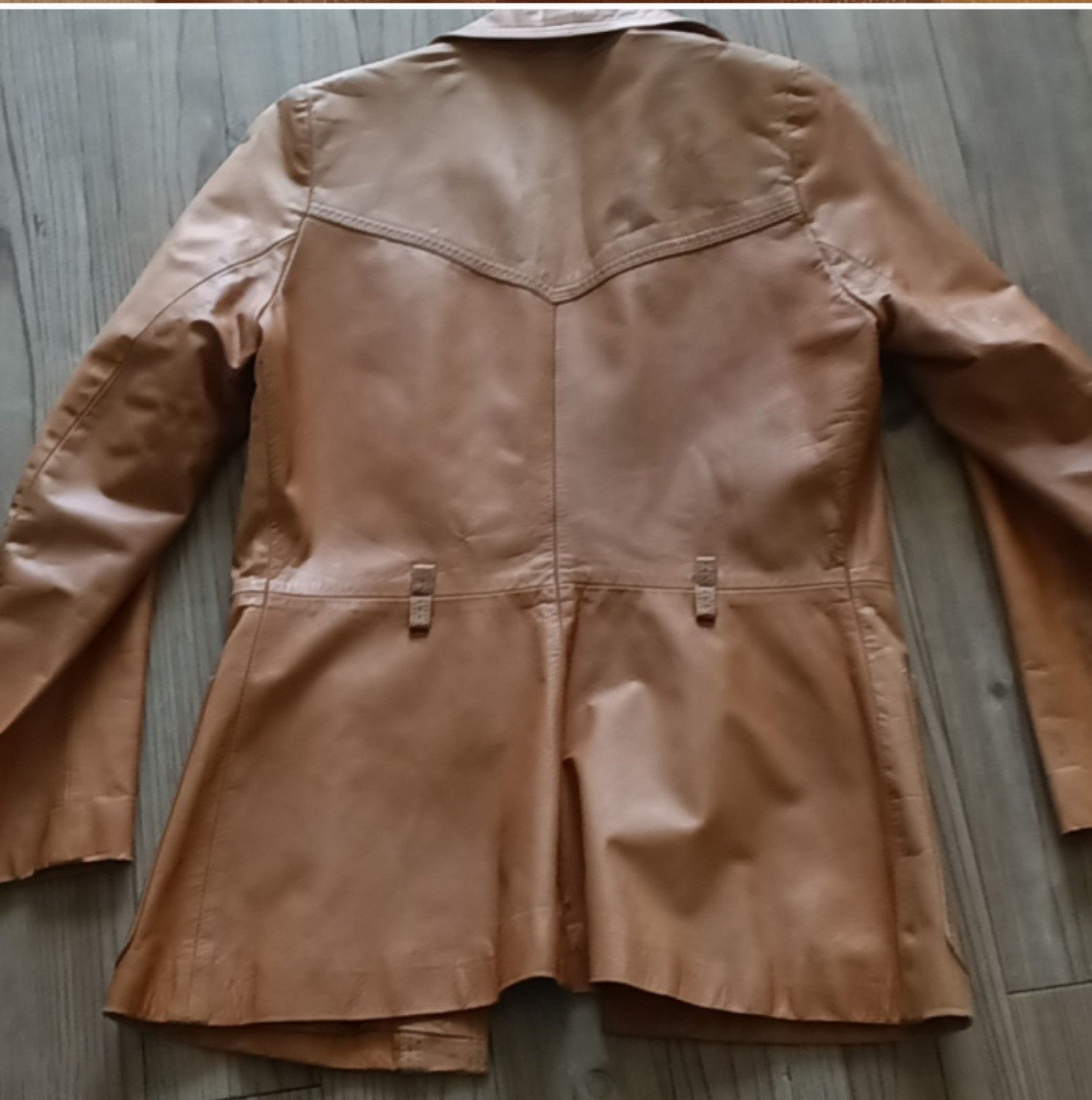 This is a genuine hippie leather sporting the disco long-pointed collars. Even the cognac color is a favored vintage back in those days.