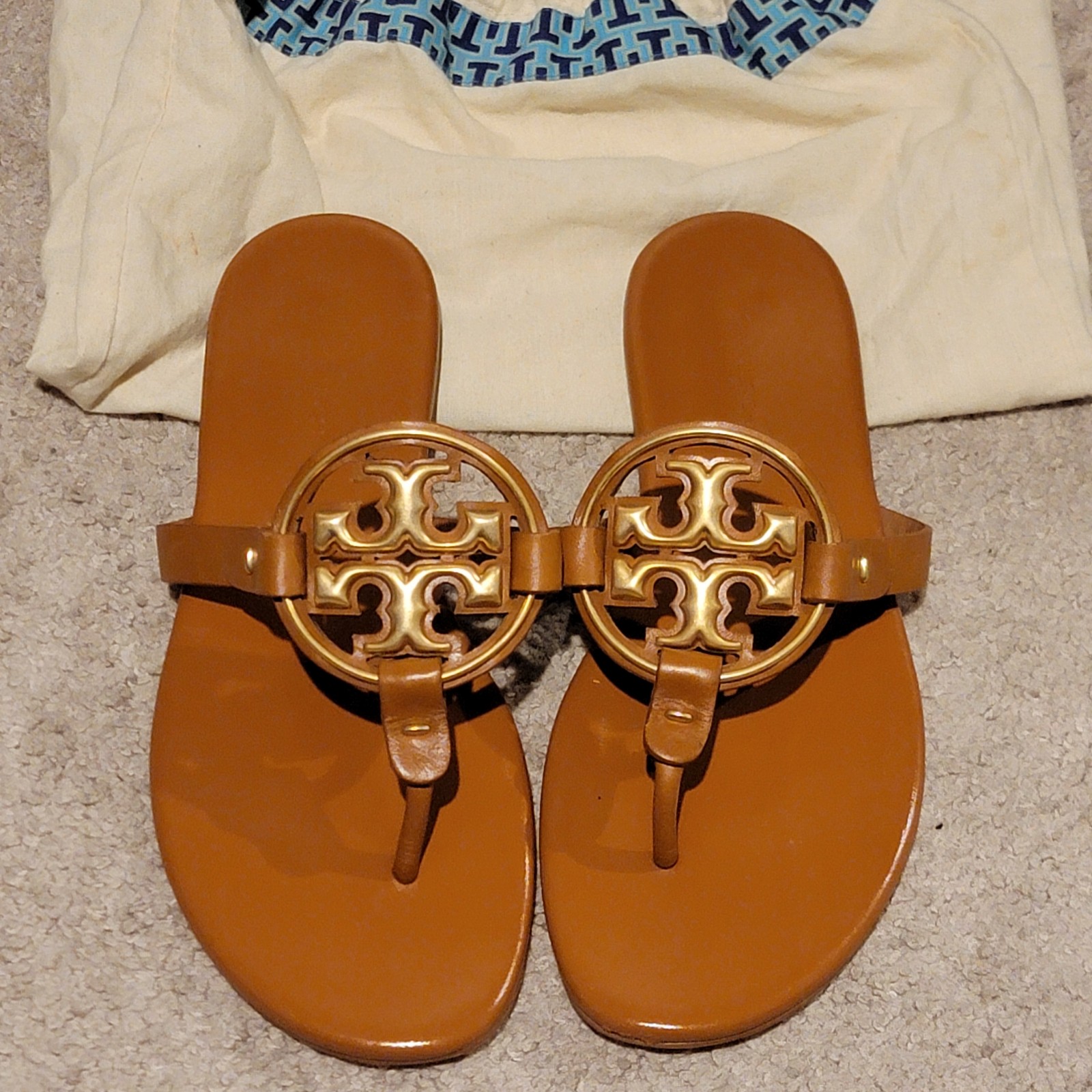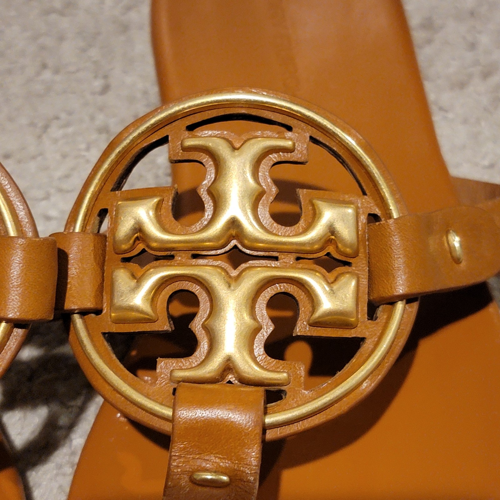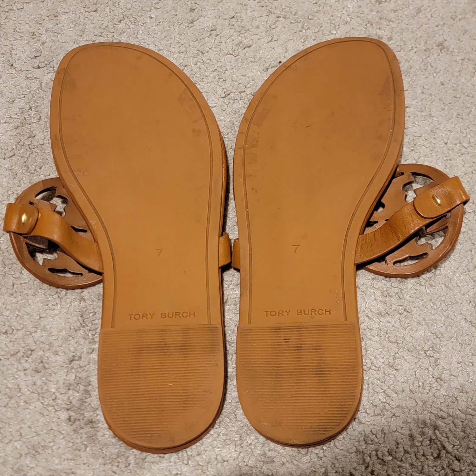 This is a pair of Tory Burch Metal Miller Soft in size 7. Color is Bourbon Miele. The iconic Tory Burch sandal, now with a supremely soft memory foam sole for long-lasting comfort and support. A refined profile with the cushioning of an extra padded footbed. Please note the footbeds have been repainted with acrylic to restore the color.