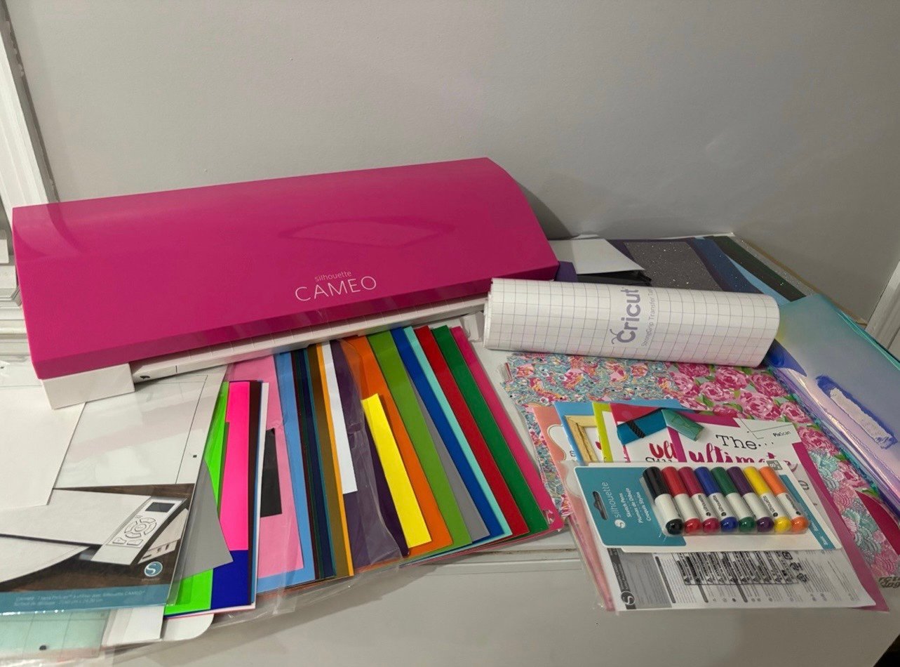 Includes machine in original box as shown comes with original instructions, book bundle, cutting mat, tons of vinyl pieces, heat transfer vinyl, glitter, a few prints a roll of transfer tape and iridescent roll. This was only used for personal use and I’ve only used it for a max of 4 times, just don’t have the need/time for it.