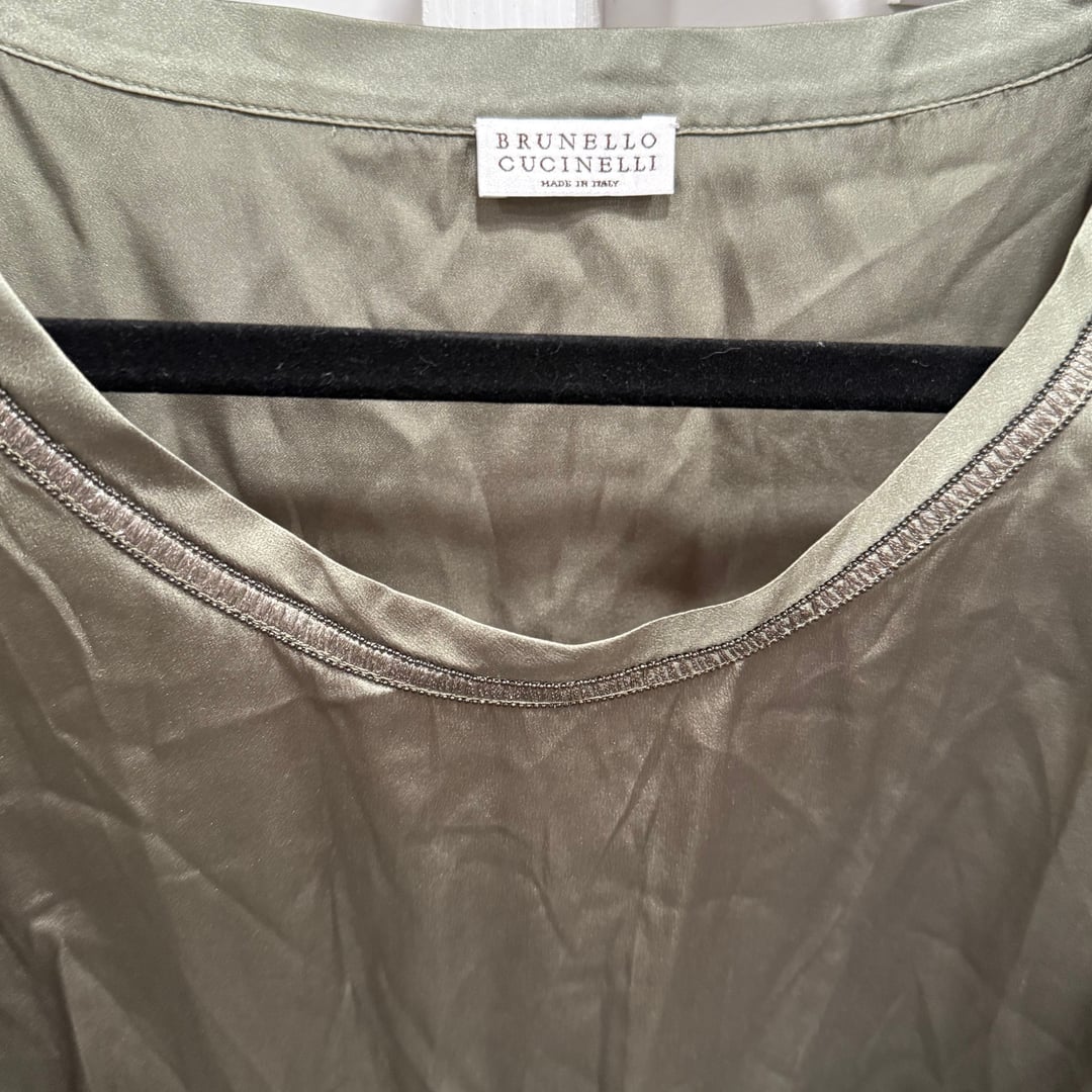 Brunello Cucinelli Women's Silk Stain Tank Top, size Large, in a rich olive green. This elegant tank is crafted from a luxurious blend of 96% silk and 4% elastane, offering a soft, flowing fit with a hint of stretch. Made in Italy, it features subtle beaded detailing around the neckline for a touch of refined sophistication. Perfect for layering or as a standalone piece, this tank elevates any outfit. Excellent pre-owned condition.